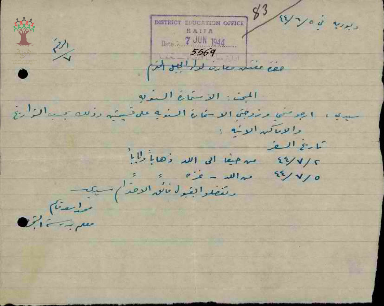 رسالة من المعلم محمد قاسم الى مفتش المعارف يطلب فيها استمارة سفره السنوية