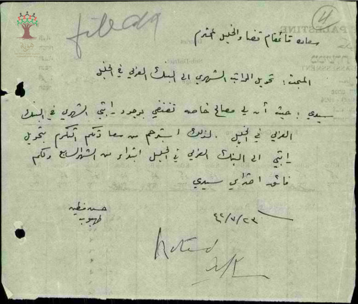 الجابي حسن فطين طهبوب يطلب تحويل راتبه إلى البنك العربي في الخليل حيث أن له مصالح تقتضي ذلك