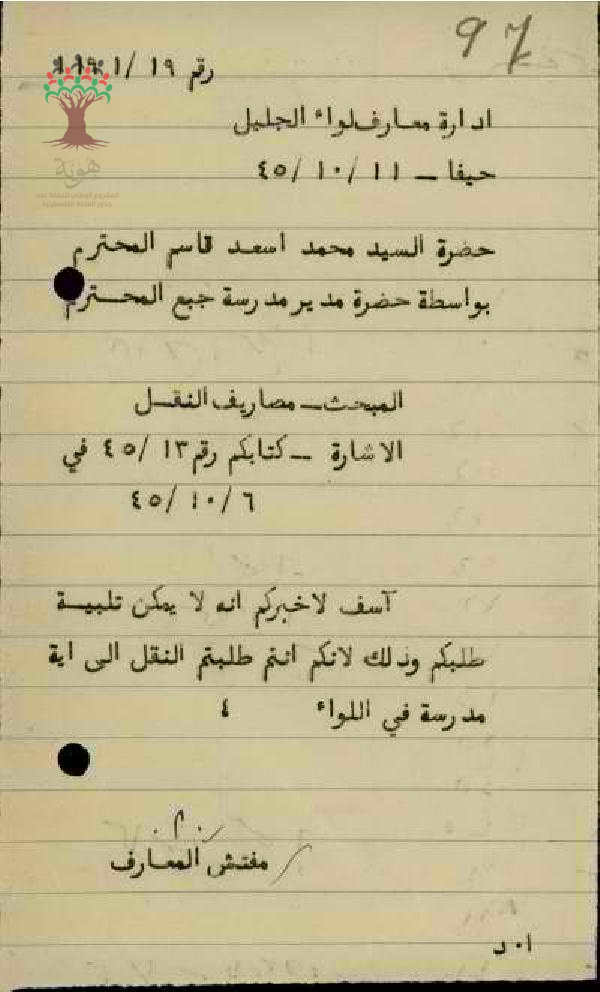 رسالة من مفتش المعارف الى المعلم محمد قاسم بخصوص عدم امكانية دفع مصاريف نقله لأنه هو من طلب نقله