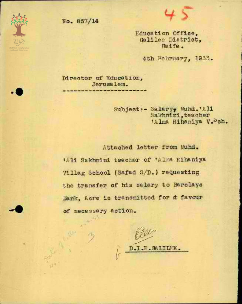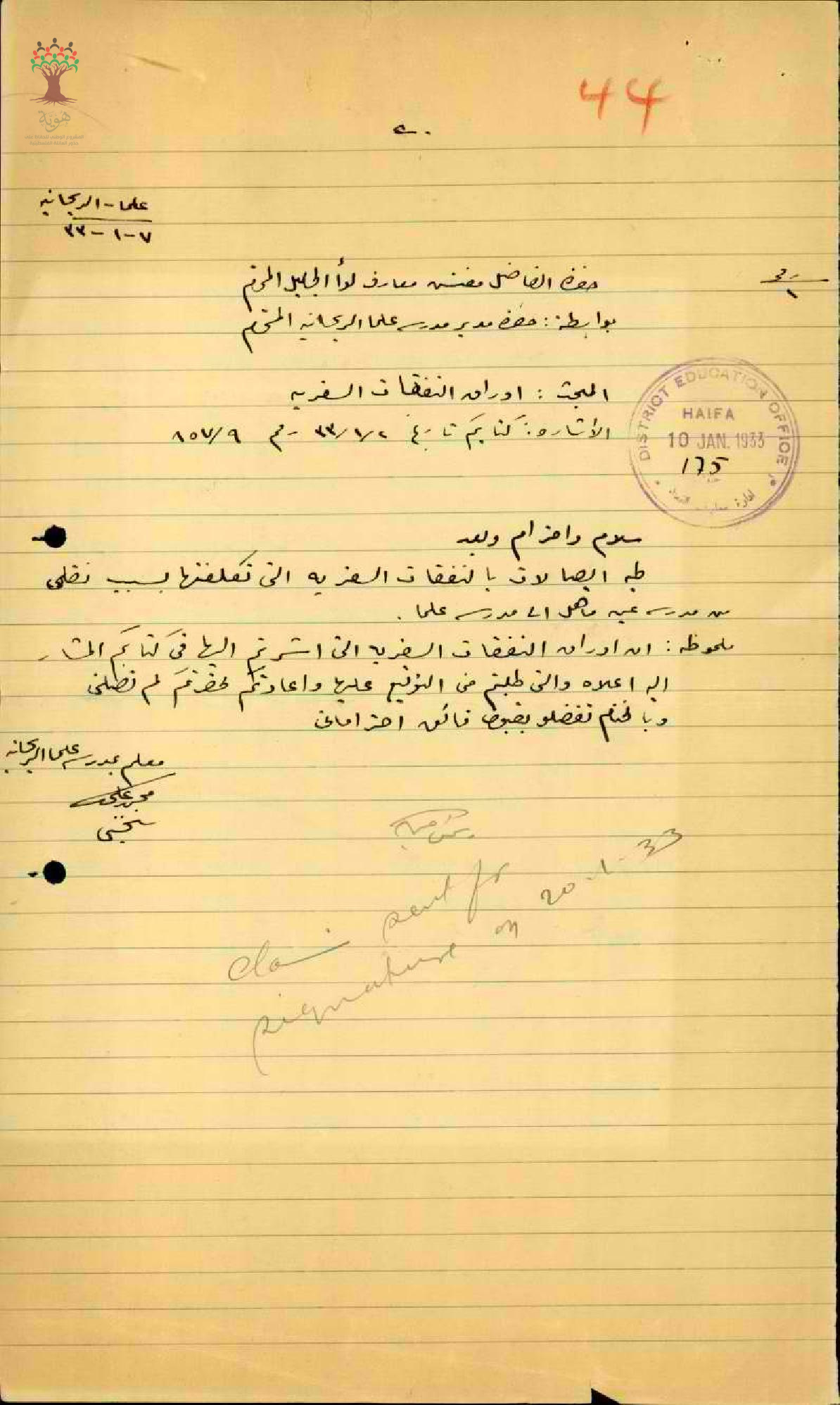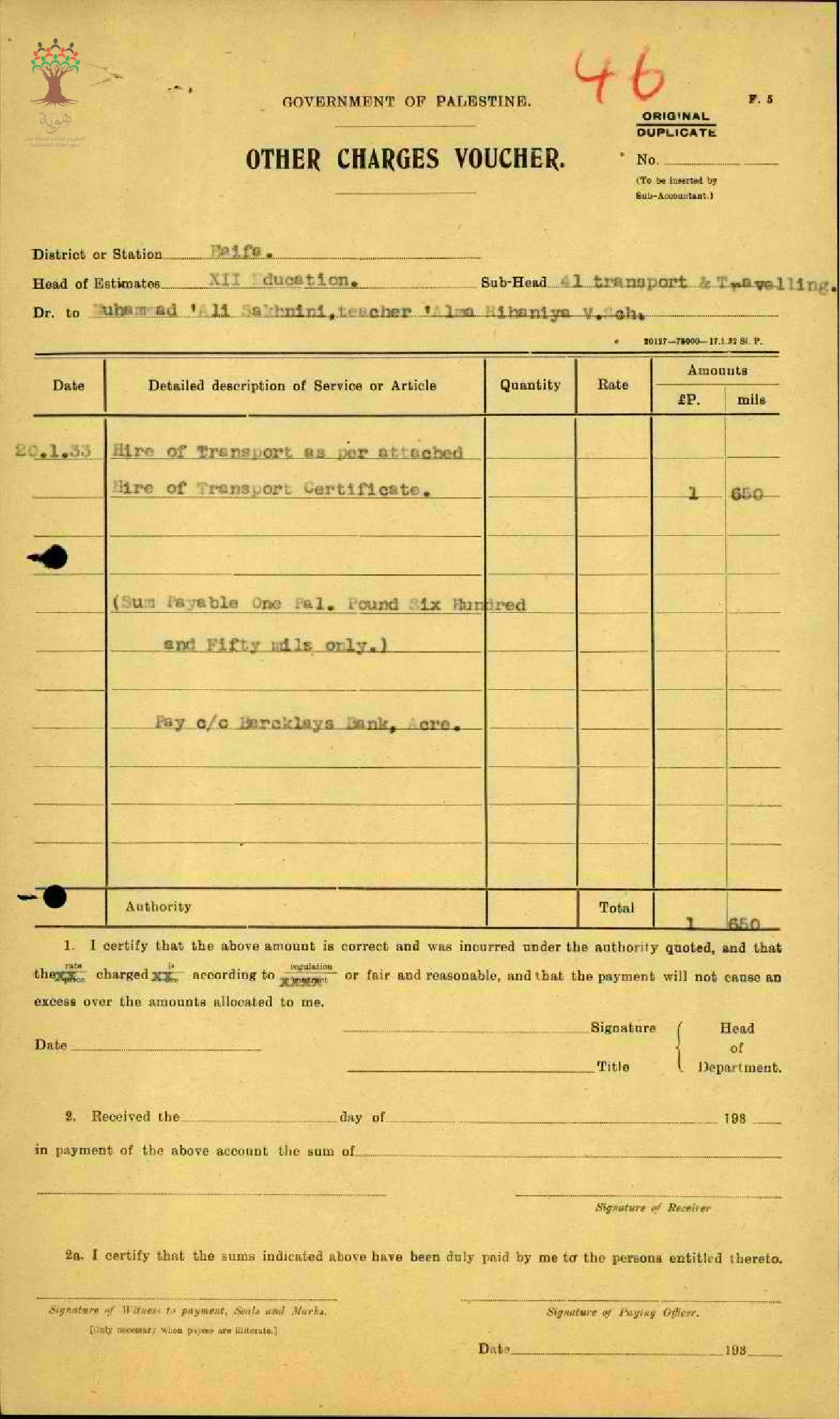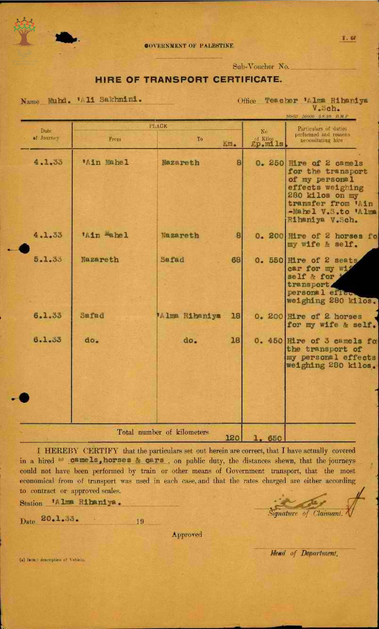 نفقات السفر للمعلم محمد علي سخنيني - سخينين- مدرسة علما