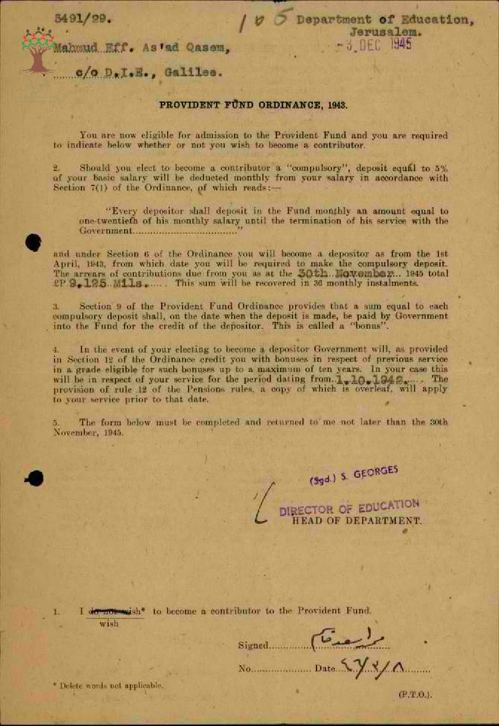 توقيع المعلم محمد قاسم على شروط اشتراكه في صندوق الاحتياط