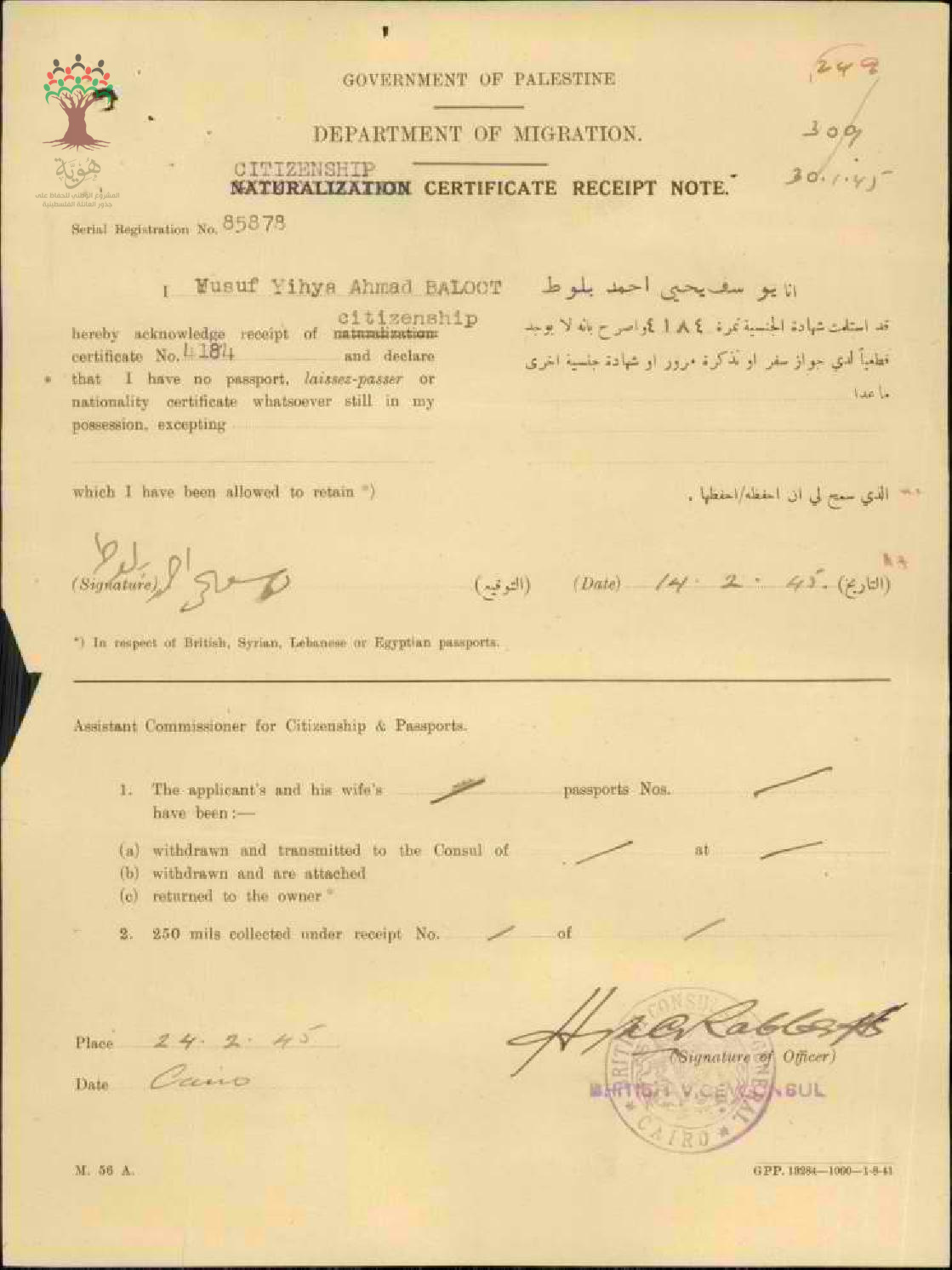 ايصال موقع من يوسف بلوط باستلام شهادة الجنسية الفلسطينية