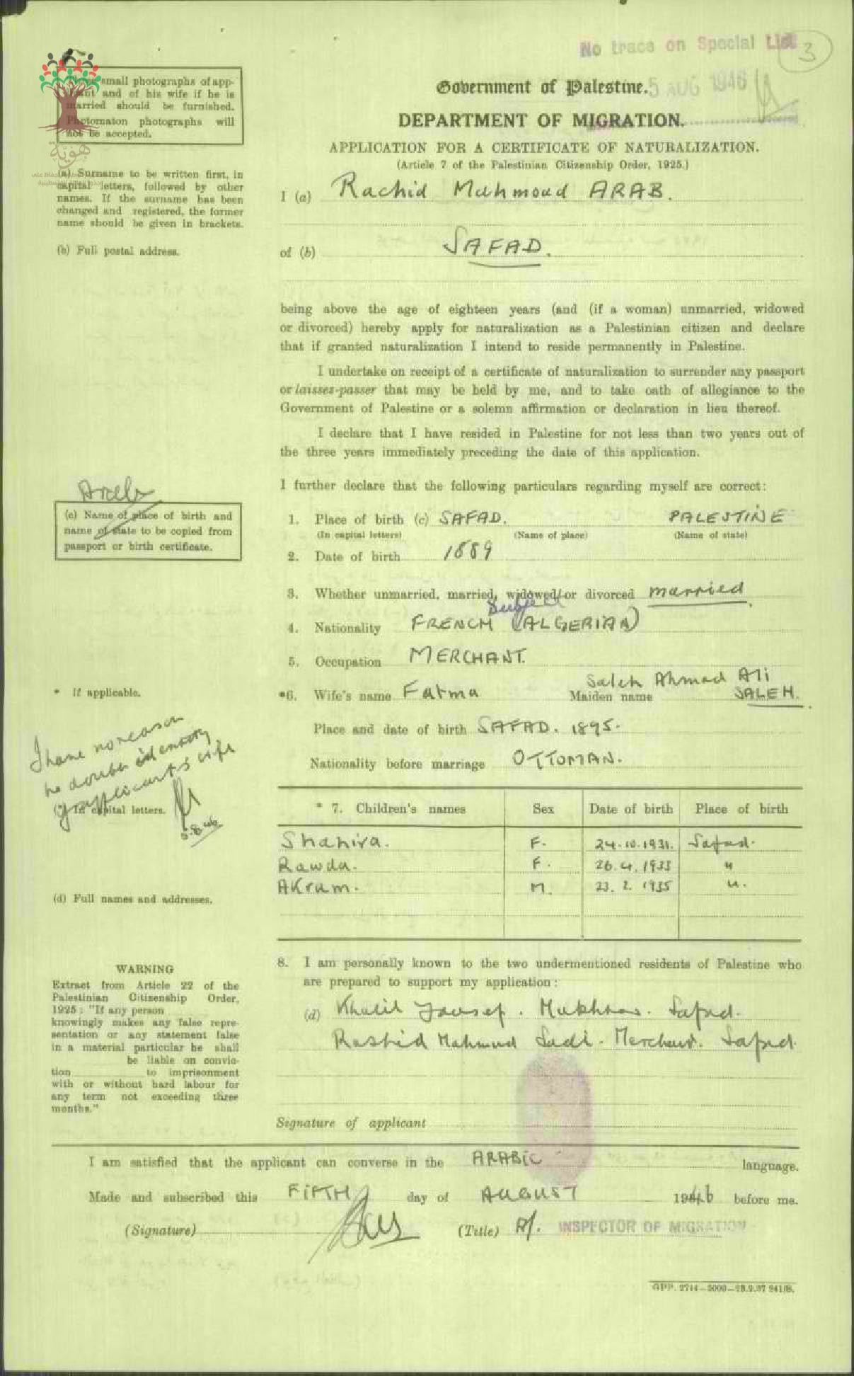 طلب الجنسية الفلسطينية - رشيد عرب - صفد / الجزائر