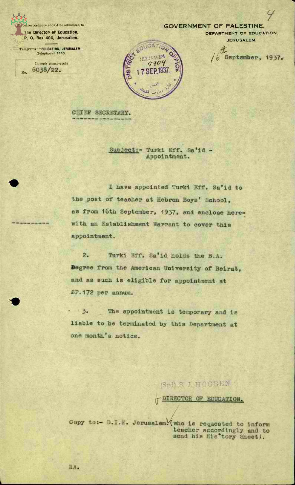 رسالة من مدير المعارف الى رئيس السكرتارية بخصوص تعيين المعلم تركي سعيد في مدرسة الخليل