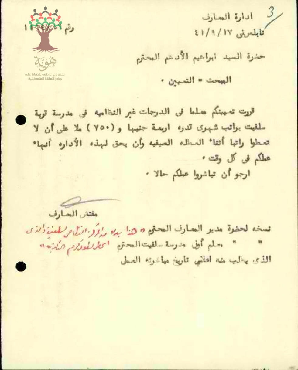 قرار تعيين ابراهيم الادهم معلما في مدرسة سلفيت