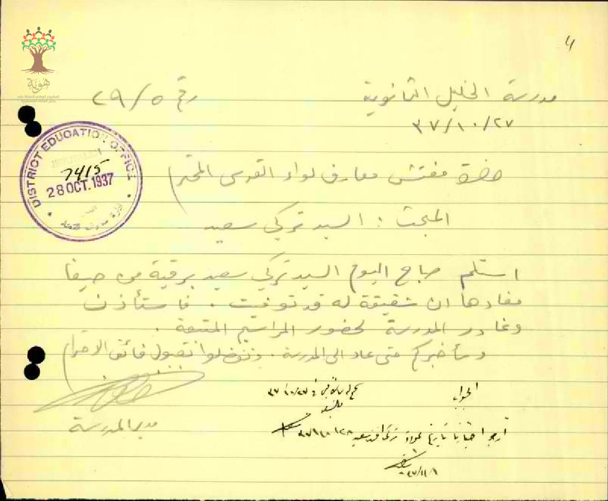 رسالة من مدير مدرسة الخليل الى مفتش المعارف بخصوص تغيب المعلم تركي سعيد بسبب وفاة شقيقته
