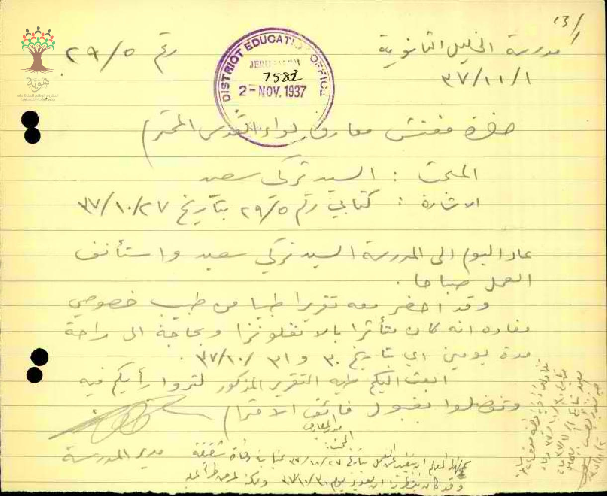 رسالة من مدير مدرسة الخليل الى مفتش المعارف بخصوص عودة المعلم تركي سعيد الى العمل وتقديمه تقرير طبي بمرضه