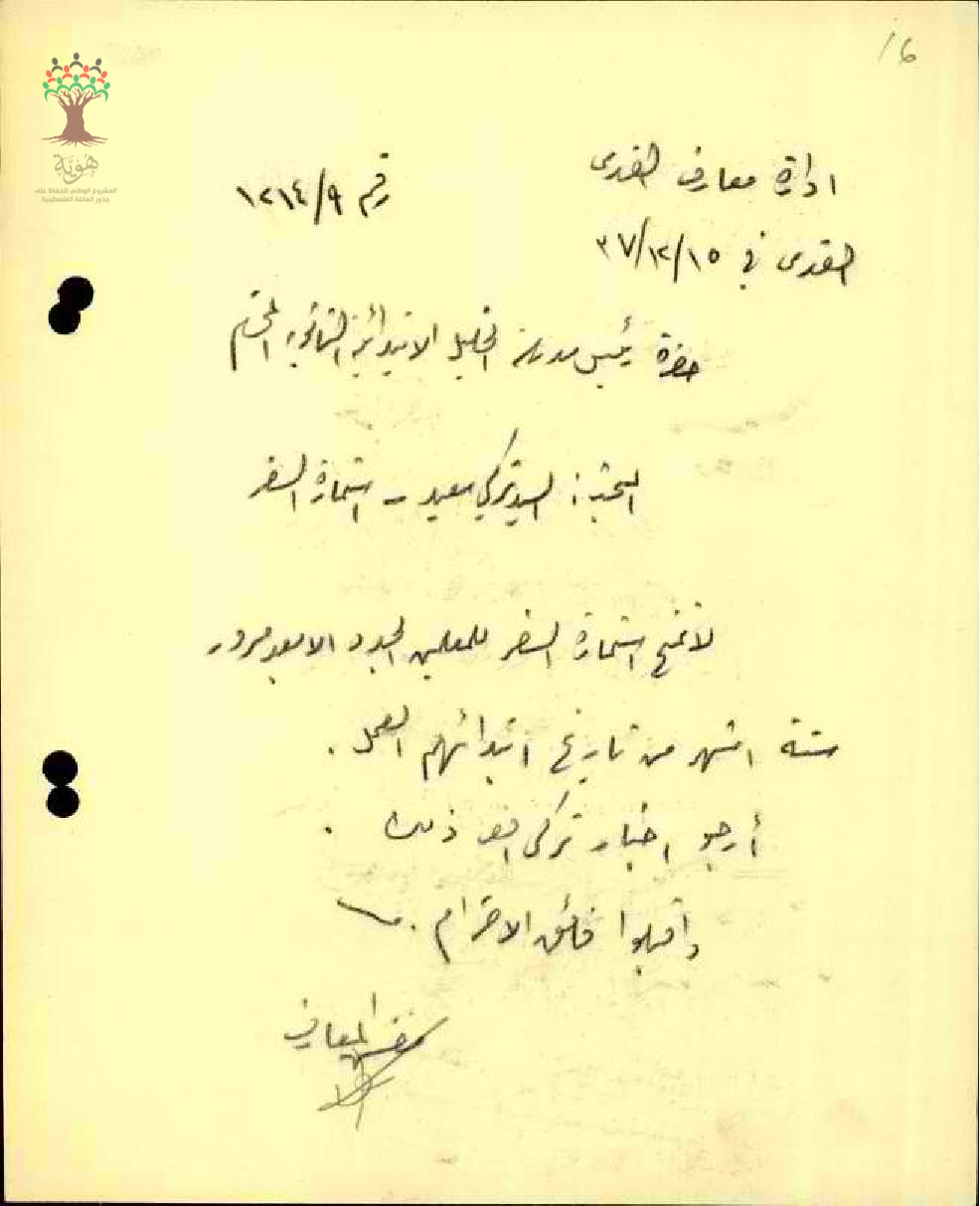 رسالة من مفتش المعارف الى المعلم تركي سعيد يخبره بأنه لا يمكن اعطائه استمارة سفر