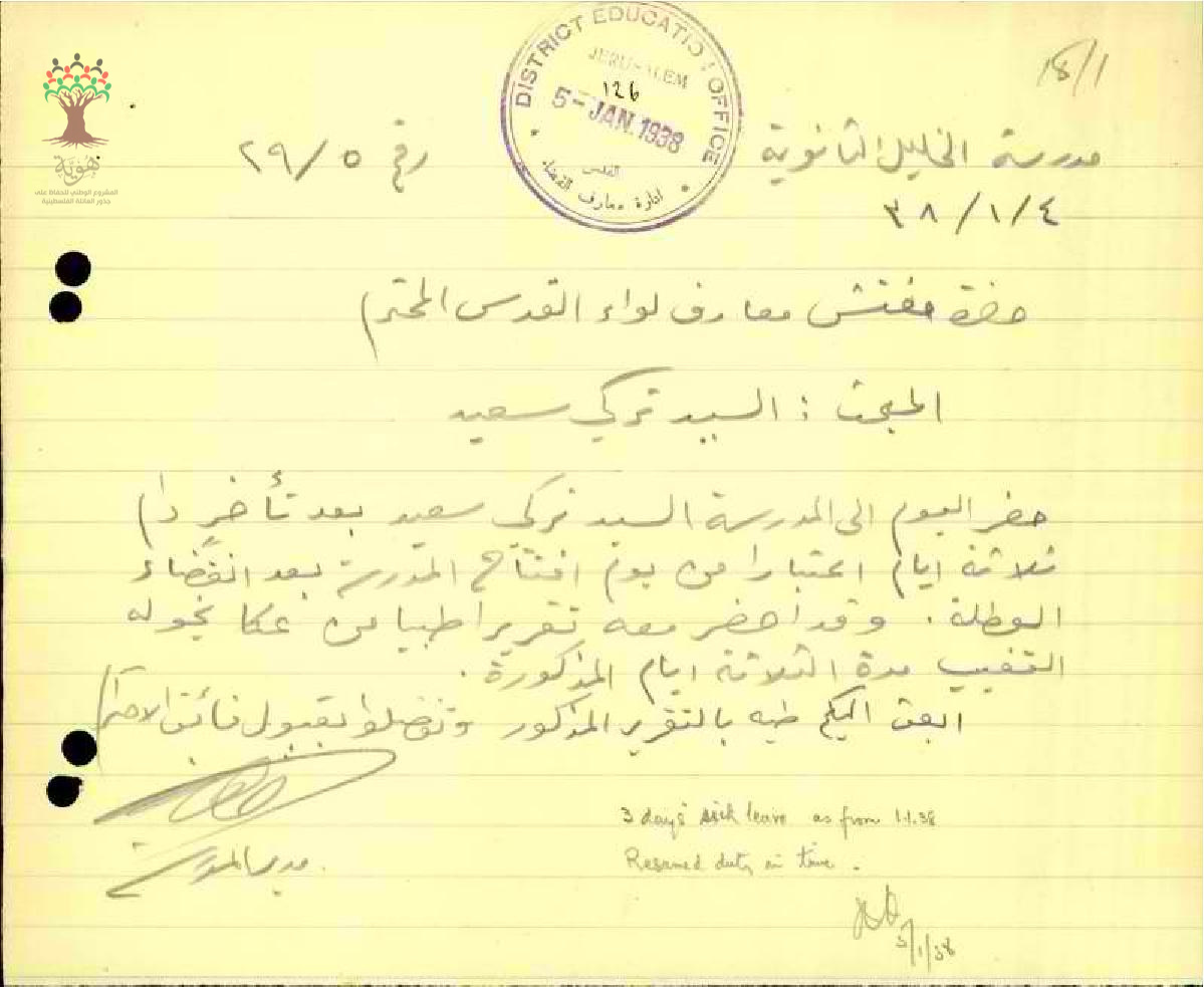 رسالة من مدير مدرسة الخليل الى مفتش المعارف بخصوص عودة المعلم تركي سعيد الى العمل