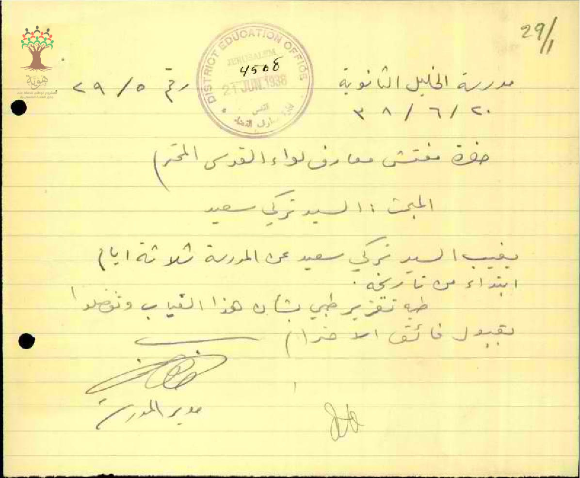 رسالة من مدير مدرسة الخليل الى مفتش المعارف بخصوص تغيب المعلم تركي سعيد مرفقة بالتقرير الطبي