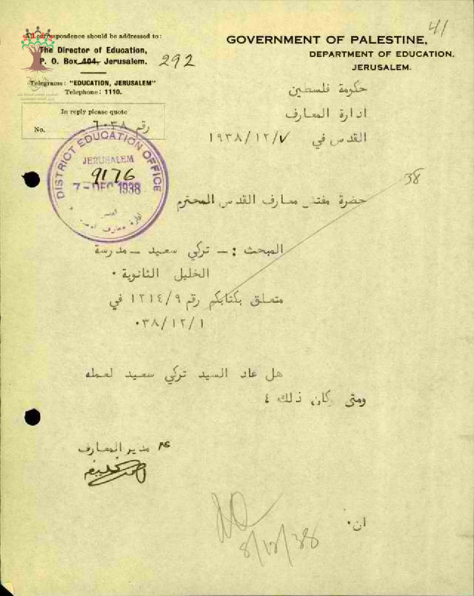 رسالة من مدير المعارف الى مفتش المعارف يسأله عن عودة المعلم تركي سعيد الى العمل
