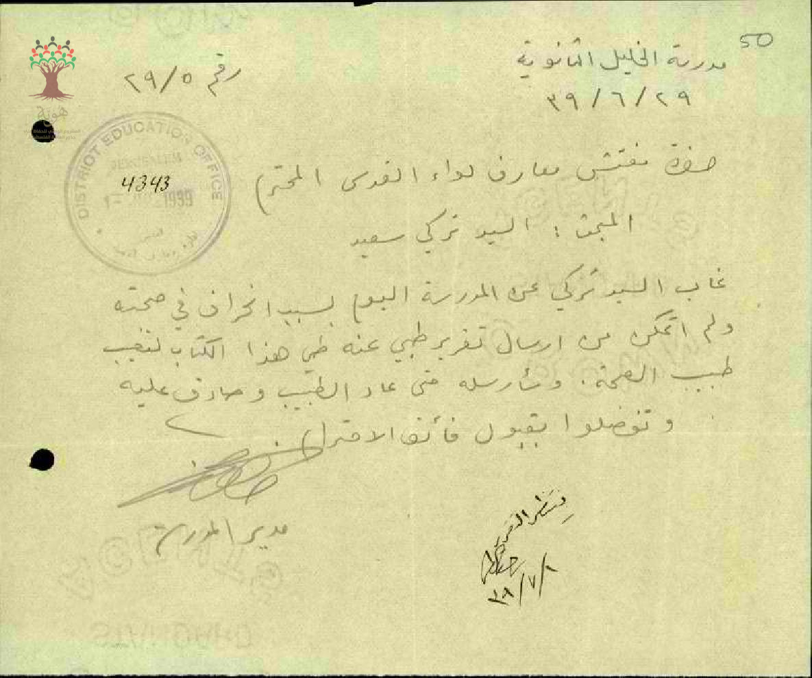 رسالة من مدير مدرسة الخليل الى مفتش المعارف بخصوص تغيب المعلم تركي سعيد