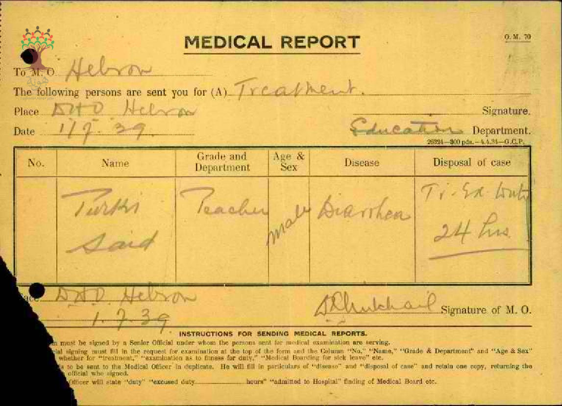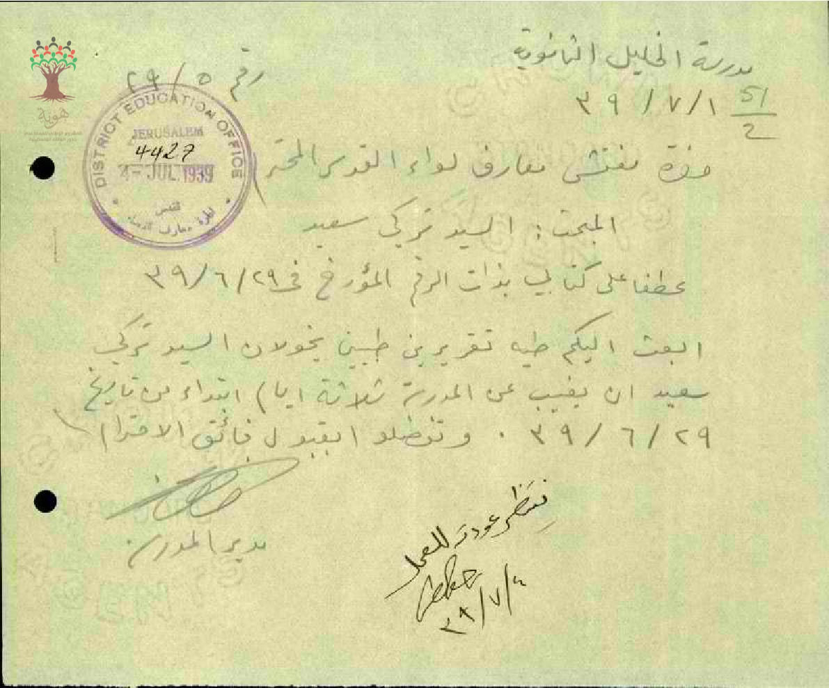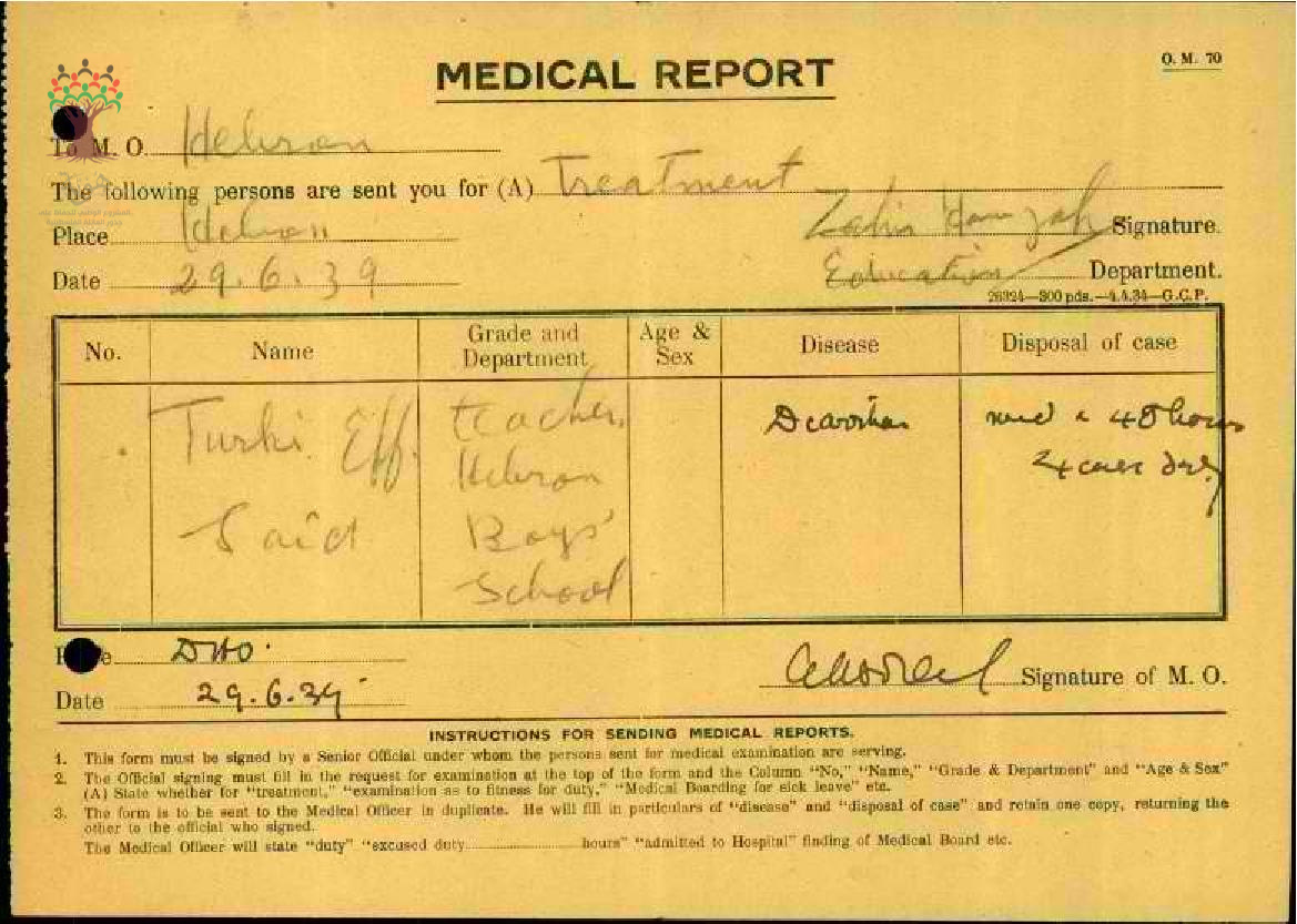 رسالة من مدير مدرسة الخليل الى مفتش المعارف بخصوص تغيب المعلم تركي سعيد مرفقة بالتقارير الطبية