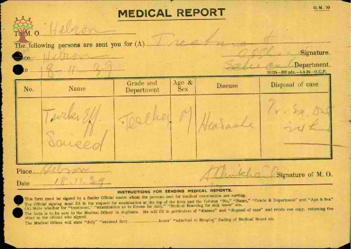 رسالة من مدير مدرسة الخليل الى مفتش المعارف بخصوص تغيب المعلم تركي سعيد مرفقة بالتقرير الطبي وعودته الى العمل