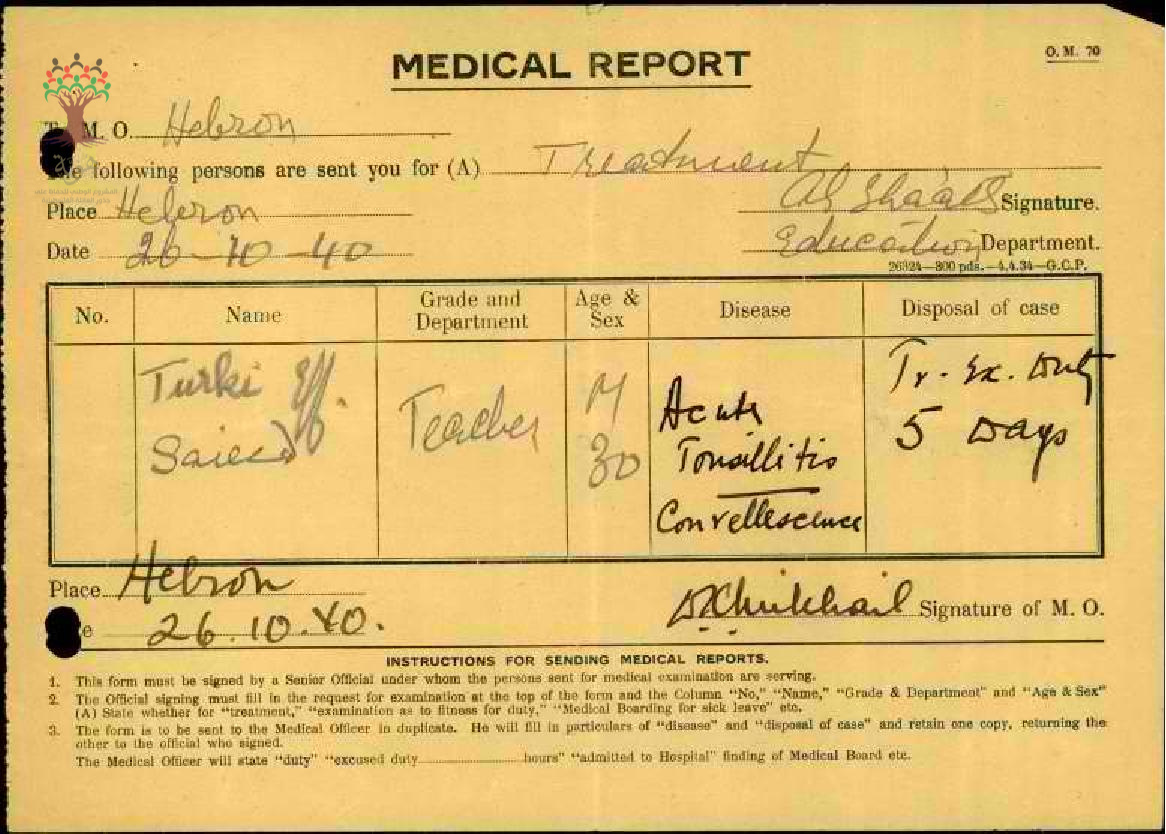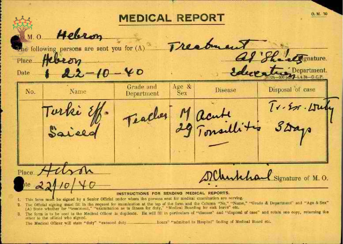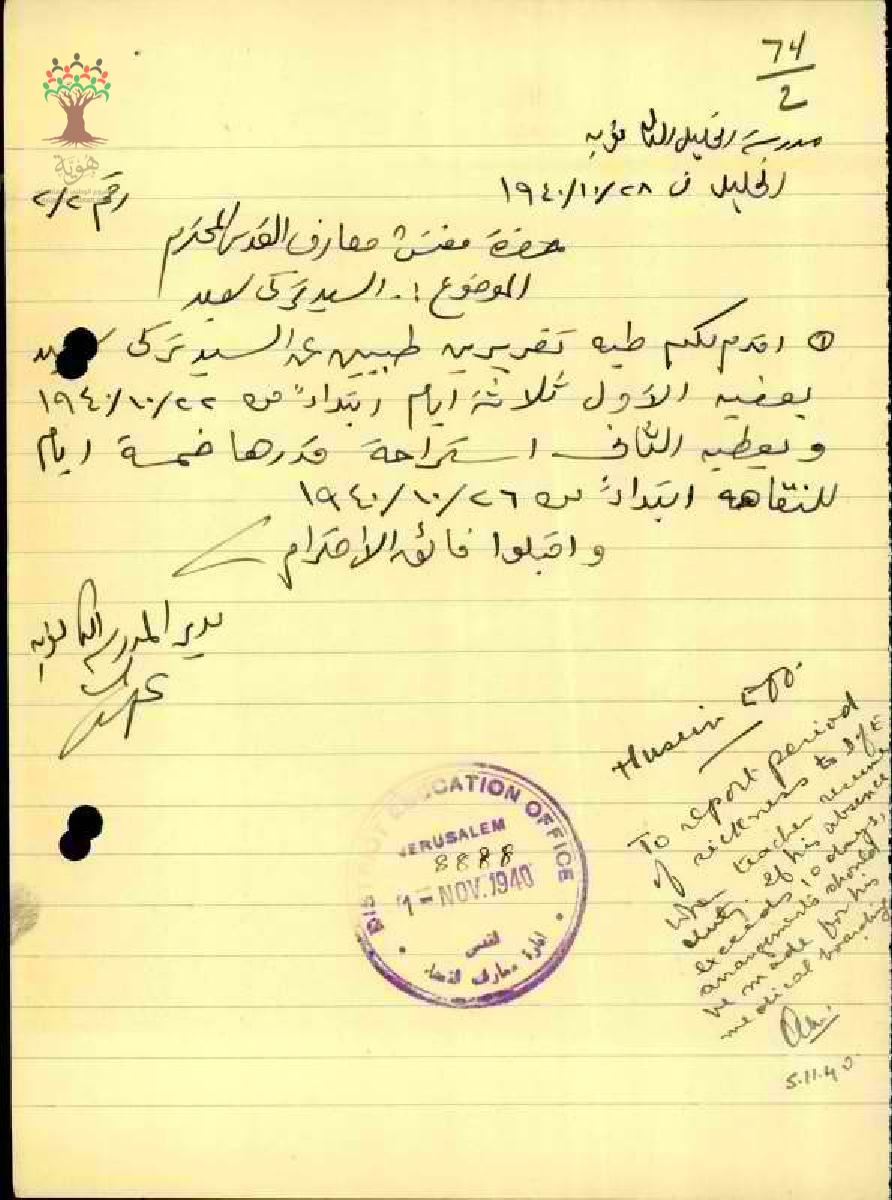 رسالة من مدير مدرسة الخليل الى مفتش المعارف بخصوص تغيب المعلم تركي سعيد مرفقة بالتقارير الطبية