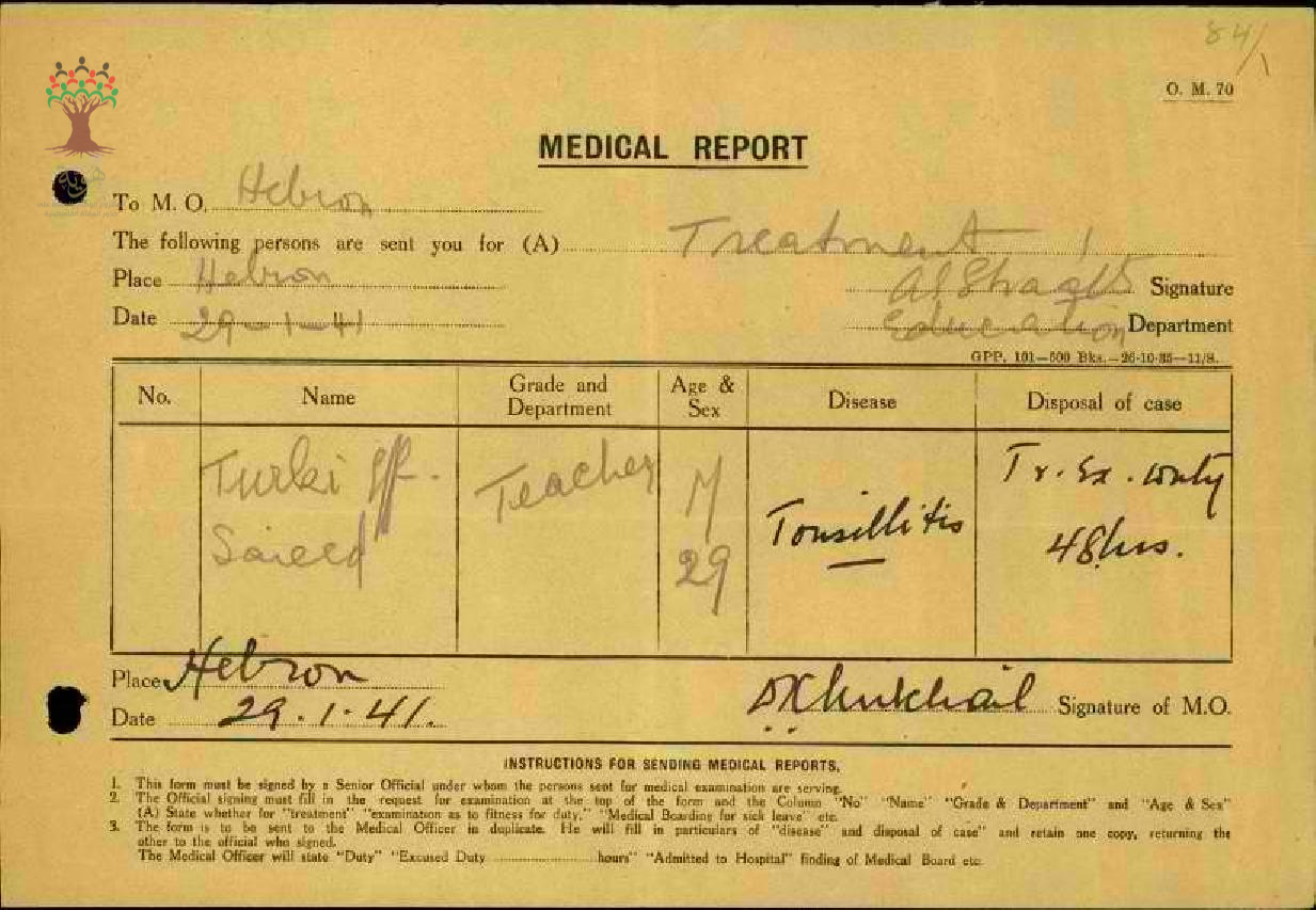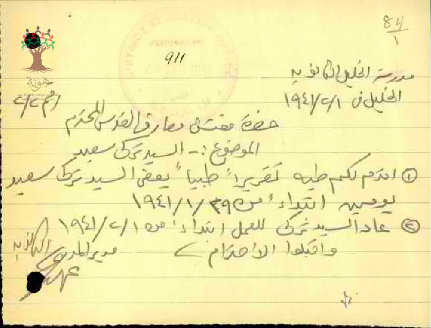رسالة من مدير مدرسة الخليل الى مفتش المعارف بخصوص تغيب المعلم تركي سعيد مرفقة بالتقرير الطبي
