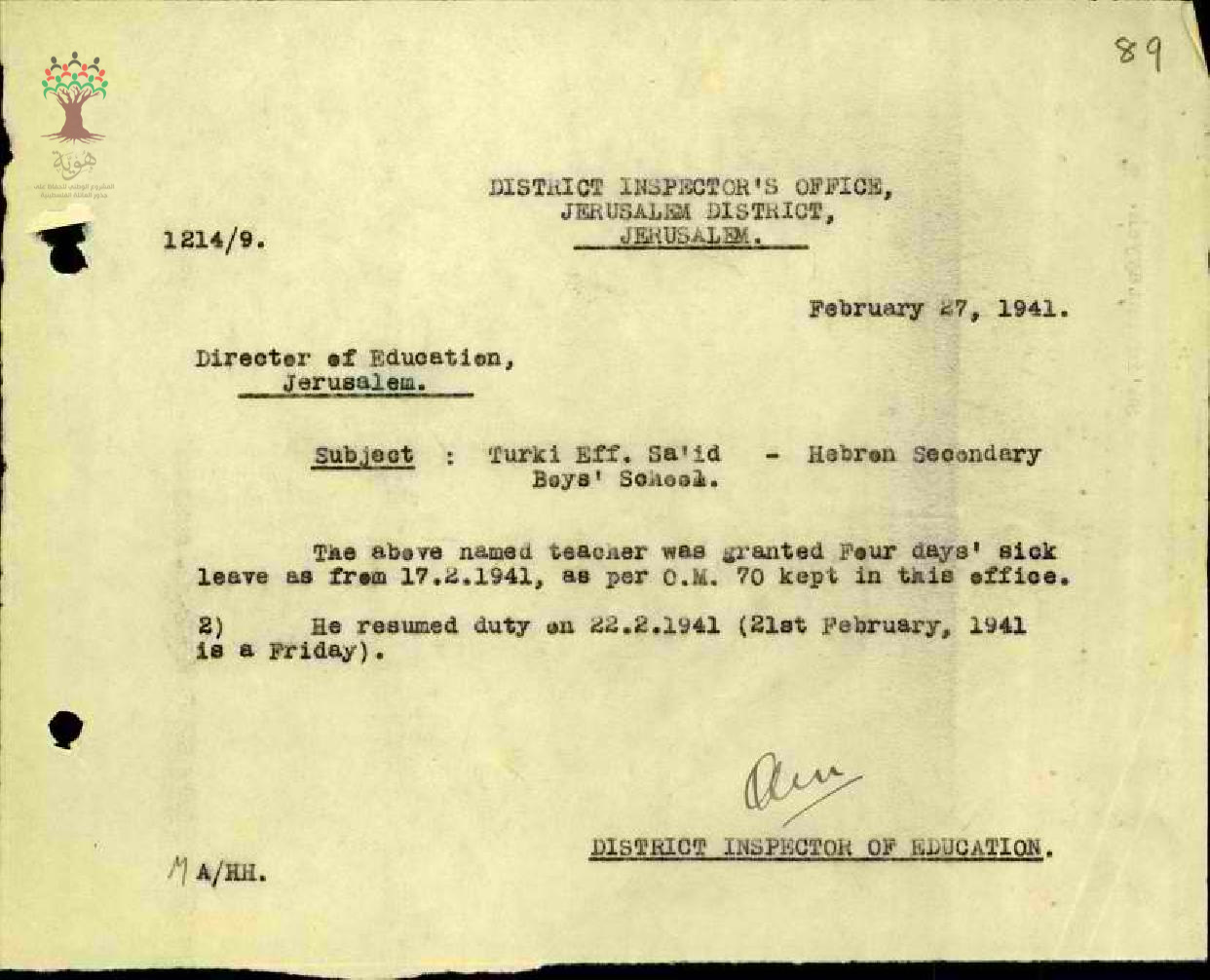 رسالة من مفتش المعارف الى مدير المعارف بخصوص اجازة مرضية للمعلم تركي سعيد وعودته للعمل