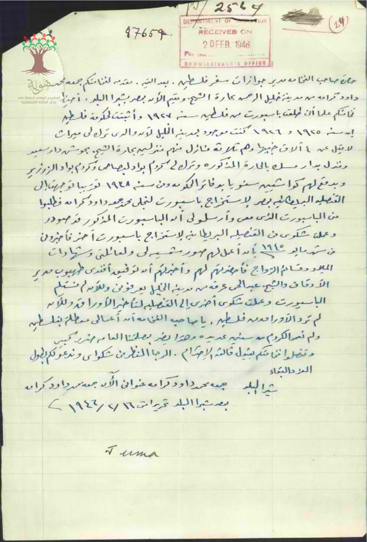 رسالة من جمعة كرامة إلى مدير جوازات سفر فلسطين بخصوص الجنسية الفلسطينية