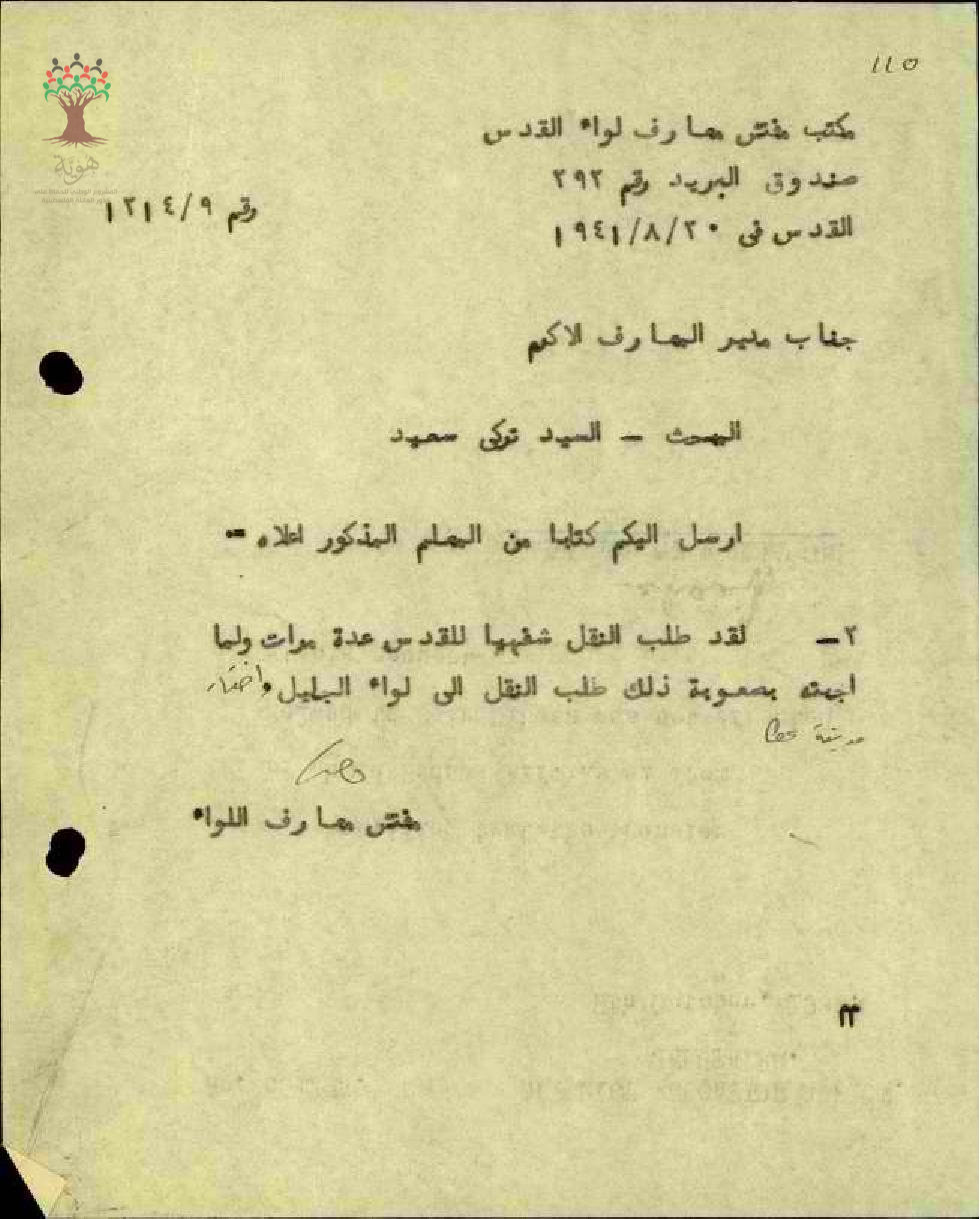 رسالة من مفتش المعارف الى مدير المعارف بخصوص نقل المعلم تركي سعيد