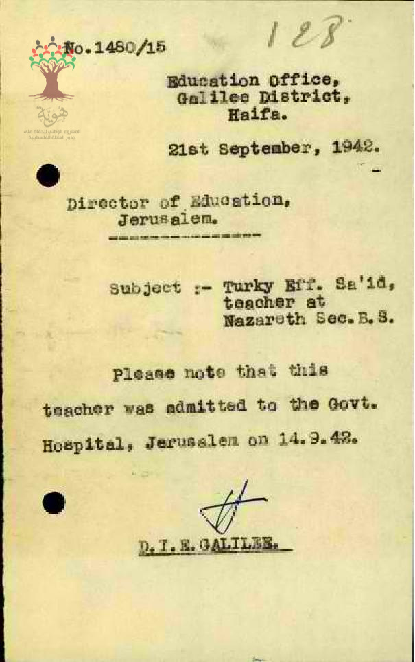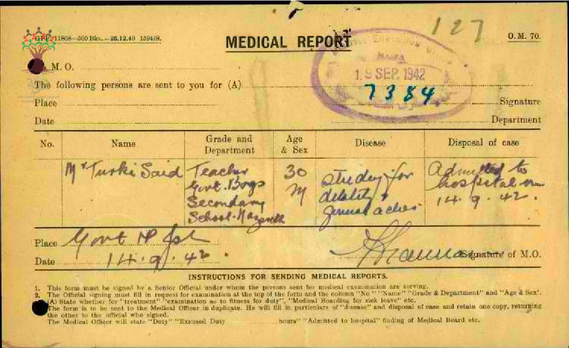 رسالة من مفتش المعارف الى مدير المعارف بخصوص اجازة مرضية للمعلم تركي سعيد بسبب دخوله الى المستشفى مرفقة بالتقرير الطبي