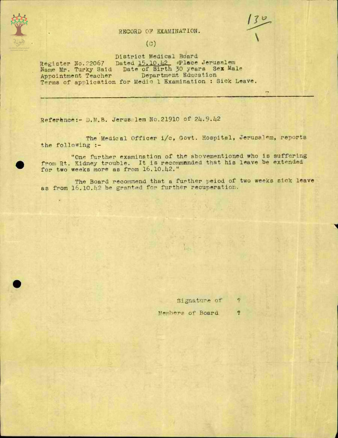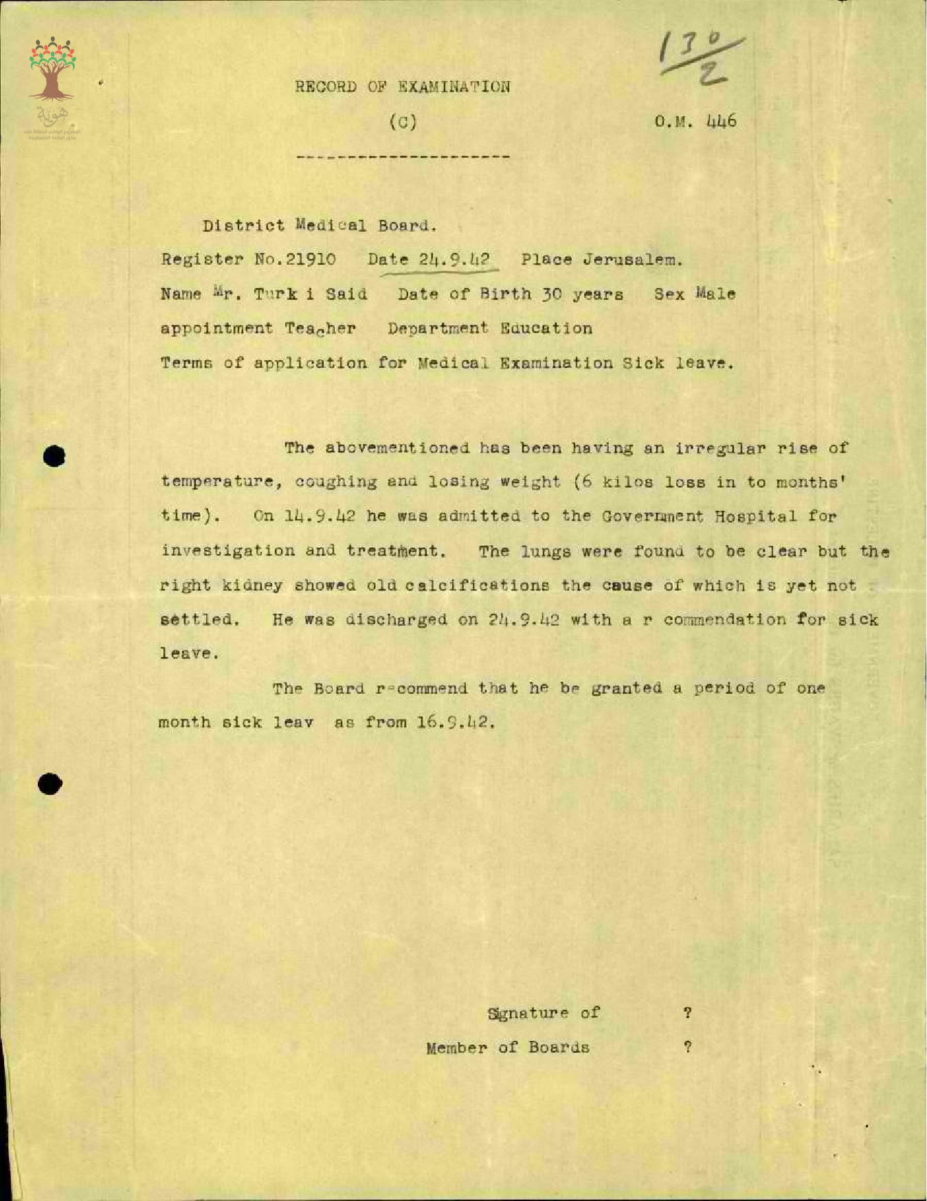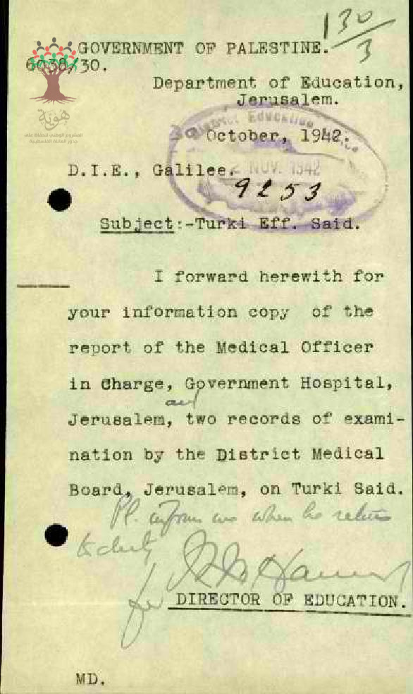 رسالة من مفتش المعارف الى مدير المعارف مرفقة بنسخة عن التقرير الصحي لحالة المعلم تركي سعيد