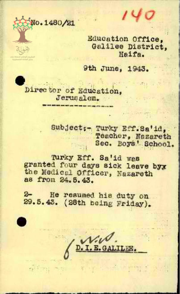 رسالة من مفتش المعارف الى مدير المعارف بخصوص اجازة مرضية للمعلم تركي سعيد وعودته للعمل