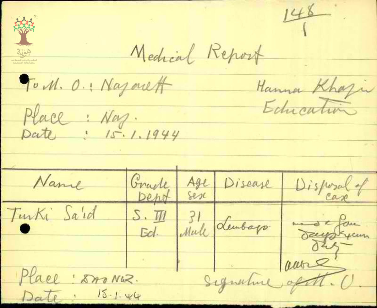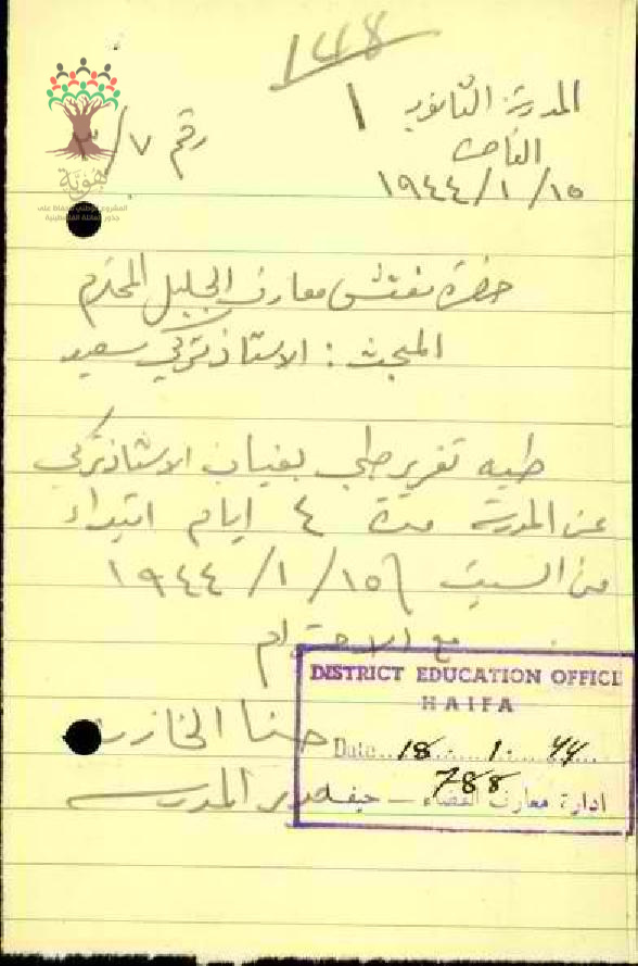 رسالة من مدير مدرسة الناصرة الى مفتش المعارف بخصوص تغيب المعلم تركي سعيد مرفقة بالتقرير الطبي