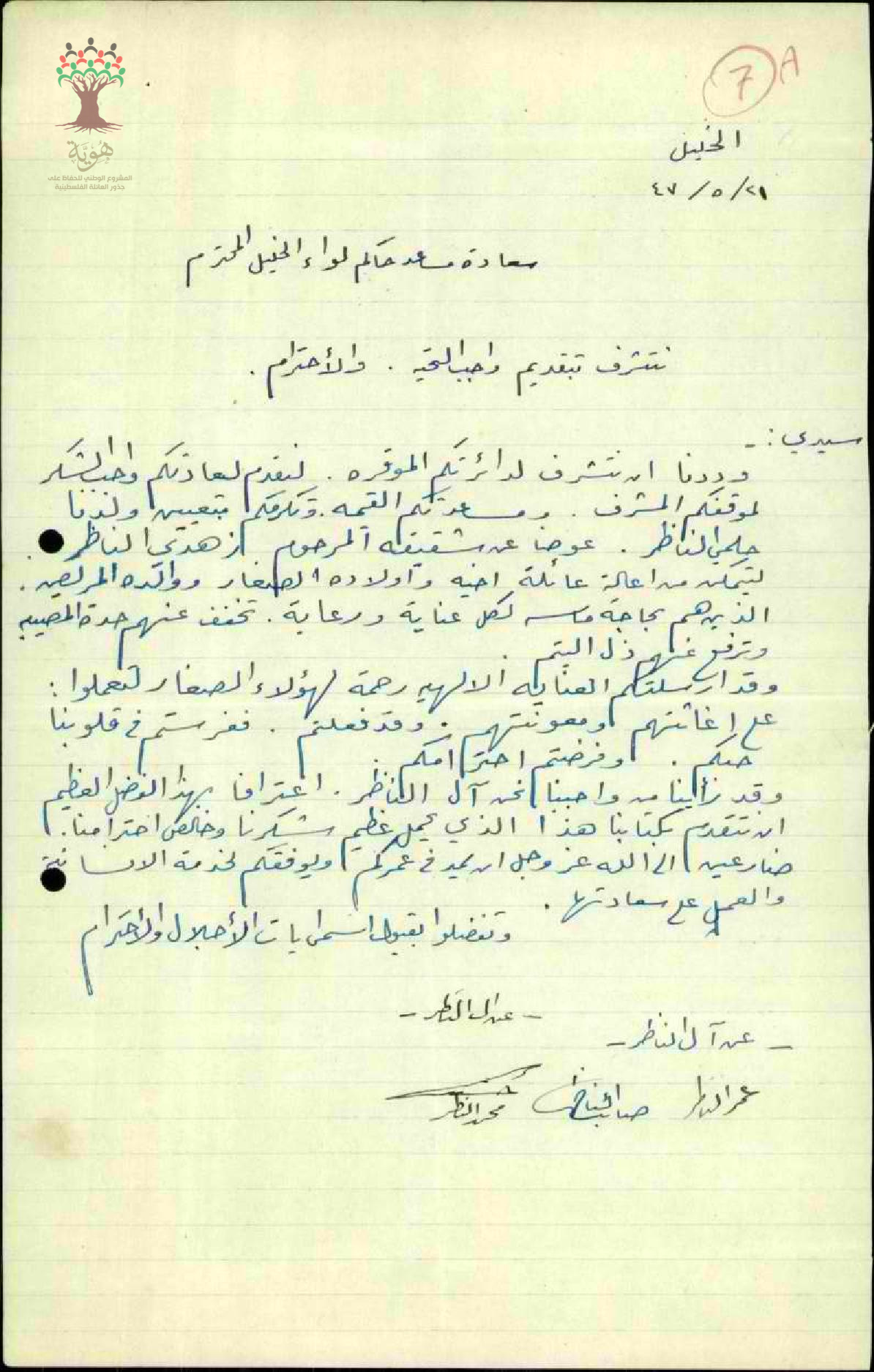 رسالة شكر من عائلة الناظر إلى مساعد حاكم لواء الخليل على تعيين حلمي الناظر بوظيفة جابي أموال مكان شقيقه المتوفي زهدي الناظر