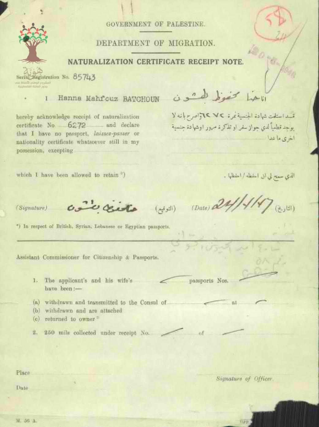 ايصال موقع من حنا محفوظ بطشون باستلام شهادة الجنسية الفلسطينية