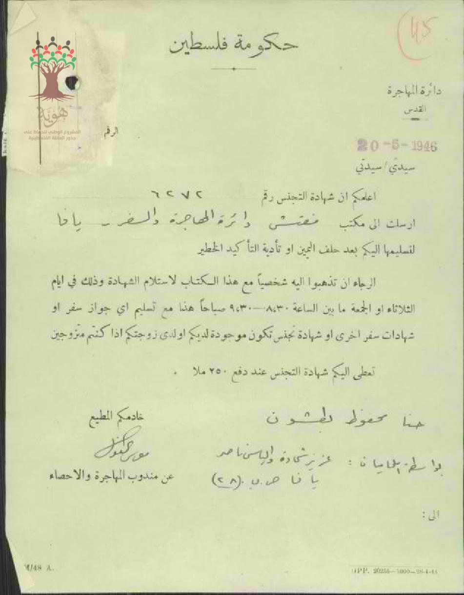 رسالة من دائرة المهاجرة للسيد حنا بطشون بخصوص استلام شهادة الجنسية الفلسطينية