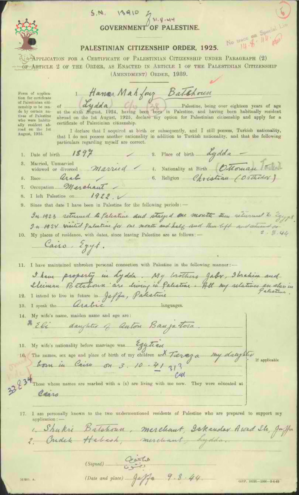 طلب الجنسية الفلسطينية - حنا بطشون - اللد / مصر