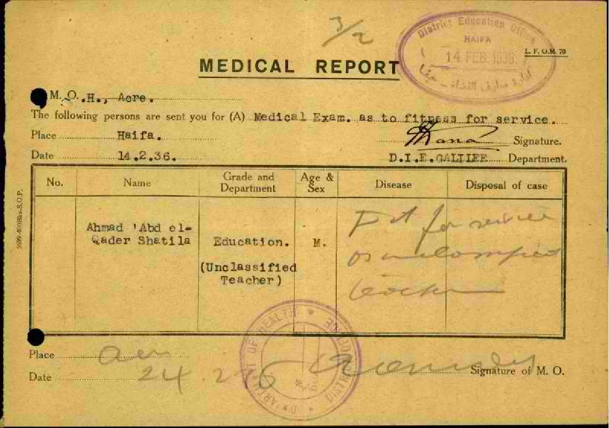 تقرير طبي لتعيين المعلم أحمد عبد القادر شاتيلا مؤقتا في مدرسة الزيب