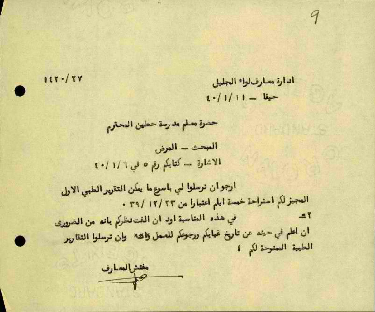 رسالة من مفتش المعارف الى المعلم عبد الحميد الزعبي يطلب منه ضرورة تزويده بتفاصيل تغيبه في وقتها