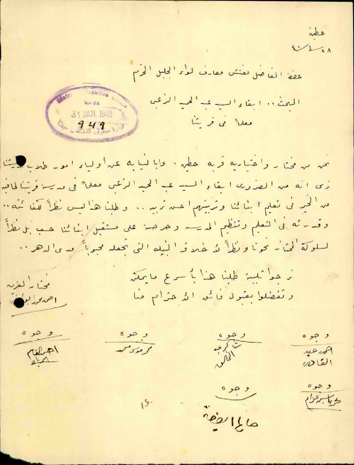 رسالة من مخاتير وأهالي قرية حطين الى مفتش المعارف يطالبون ببقاء المعلم عبد الحميد الزعبي في عمله في مدرسة القرية