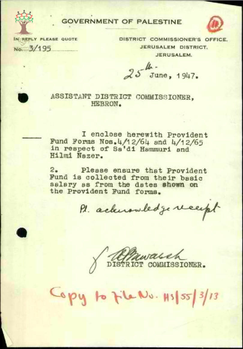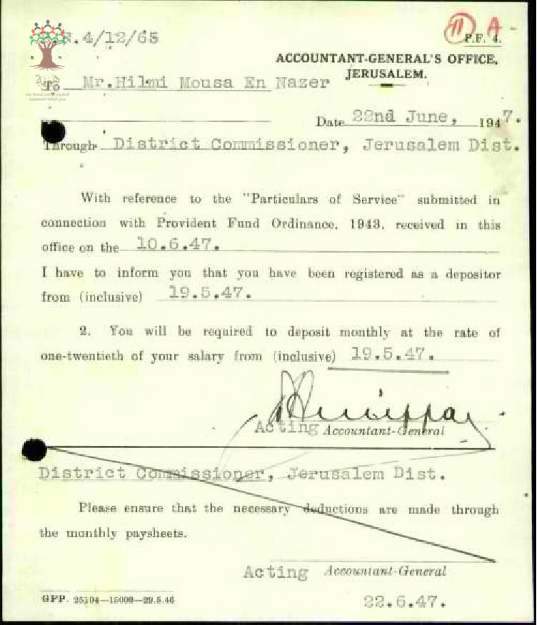 حلمي الناظر تثبيت في الوظيفة واشتراك في صندوق الادخار بدءاً من 19/5/1947