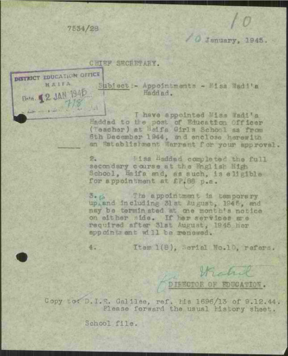 رسالة من مدير المعارف الى رئيس السكرتارية بخصوص تعيين المعلمة وديعة الياس حداد في مدرسة حيفا