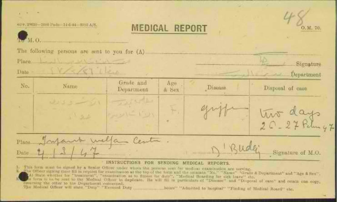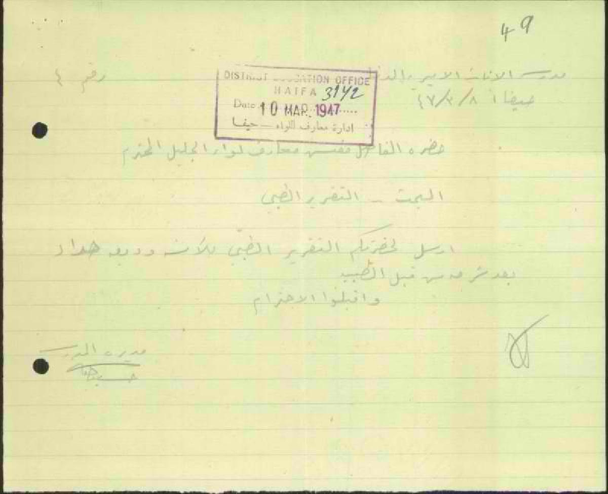 رسالة من مديرة مدرسة حيفا الى مفتش المعارف مرفقة بتقرير طبي لتغيب المعلمة وديعة حداد