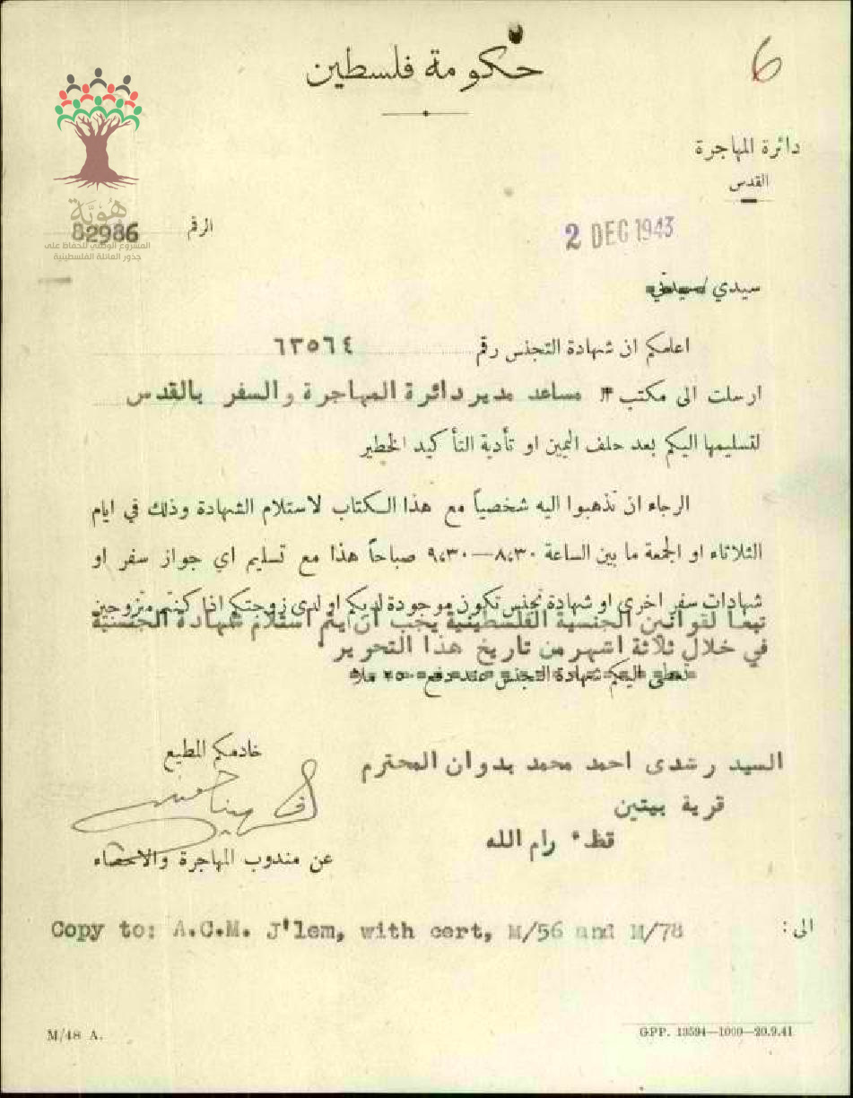 رسالة من دائرة المهاجرة للسيد رشدي بدوان بخصوص استلام شهادة الجنسية الفلسطينية