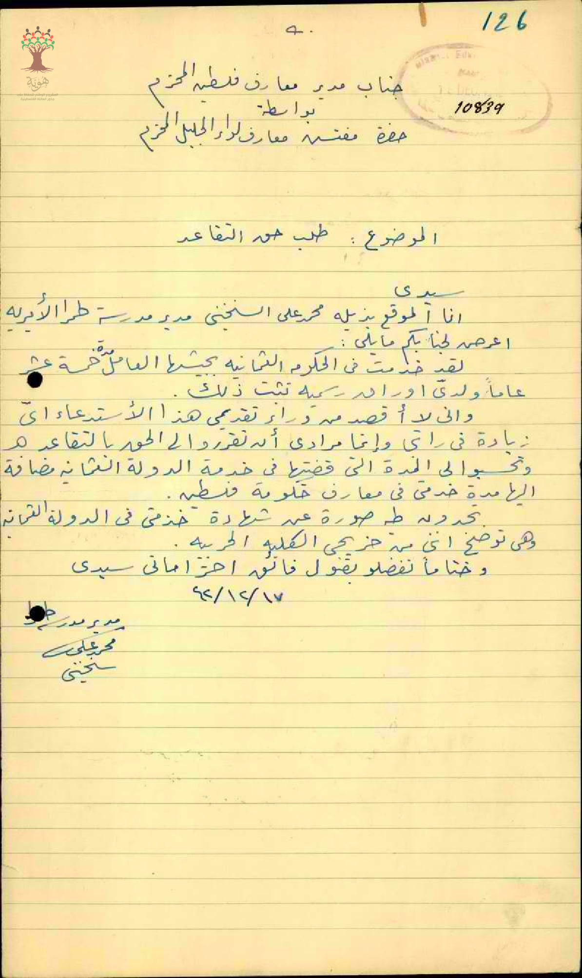طلب تقاعد مقدم من المعلم محمد علي سخنيني - سخنين - مدرسة طمرة