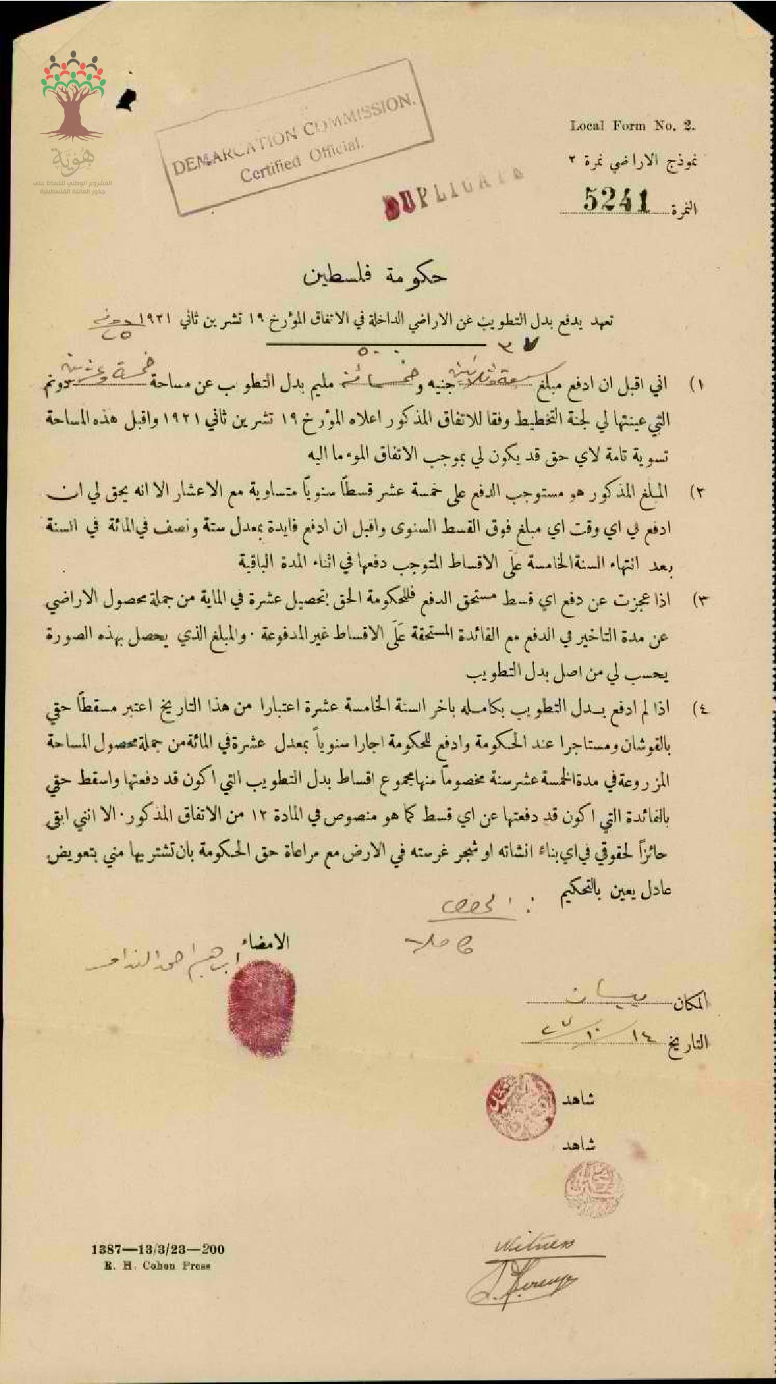 تعهد بدفع تطويب أرض ابراهيم أحمد النداف في بيسان