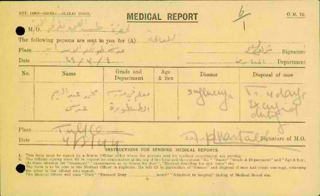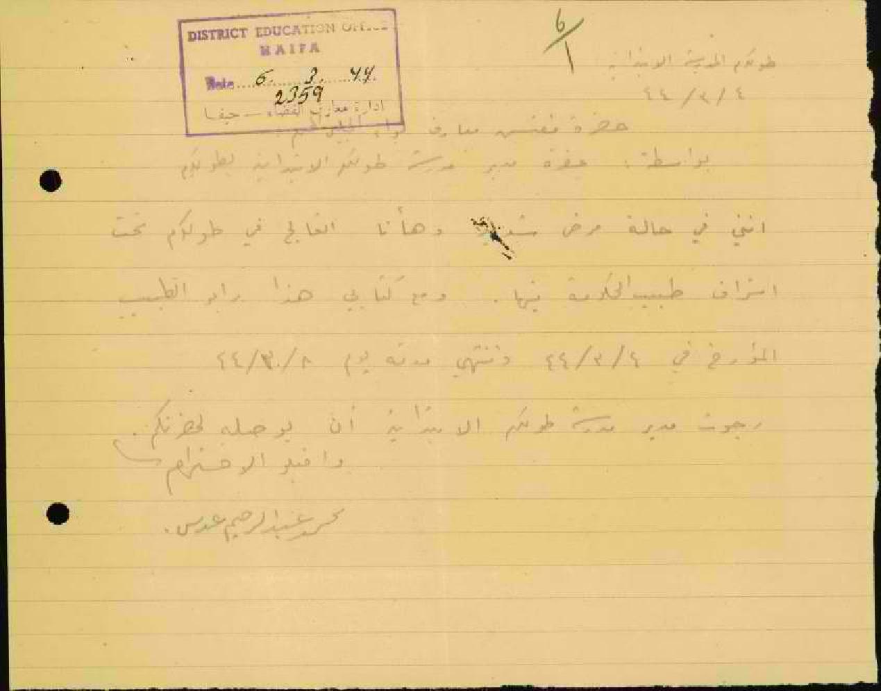 رسالة من المعلم محمد عدس الى مفتش المعارف بخصوص تغيبه عن العمل مرفقة بالتقارير الطبية