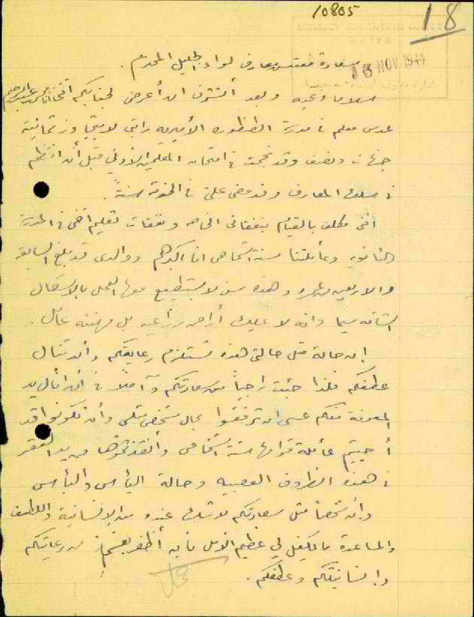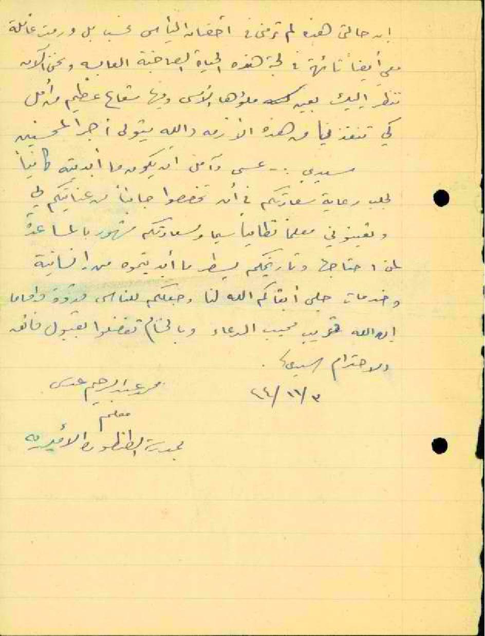 رسالة من المعلم محمد عدس الى مفتش المعارف يطلب فيها ترقيته الى معلم نظامي