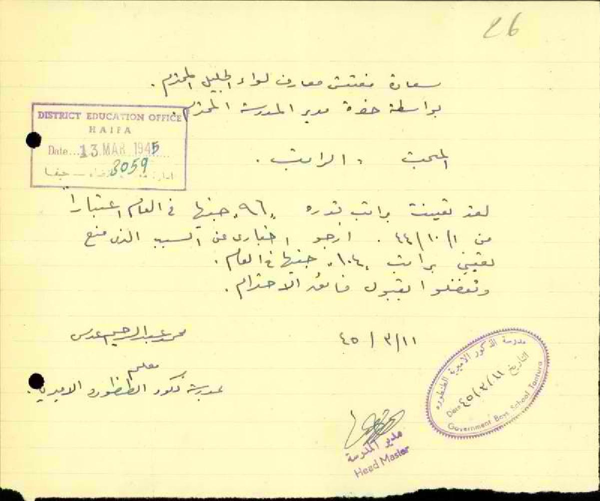 رسالة من المعلم محمد عدس الى مفتش المعارف يسأل عن سبب عدم زيادة راتبه
