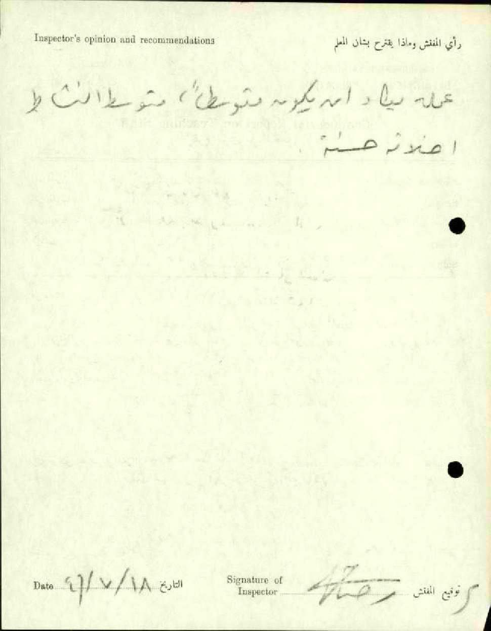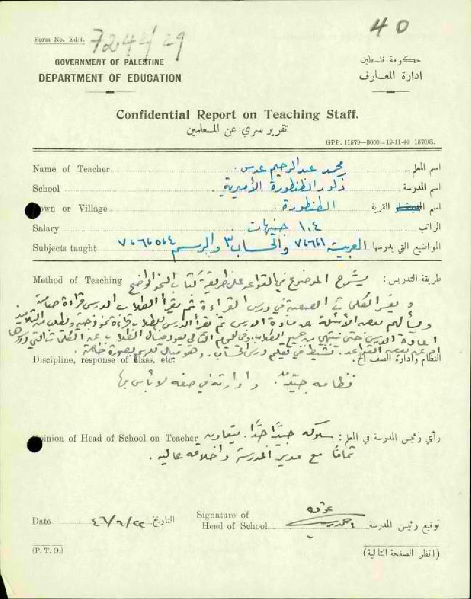 تقرير تفصيلي عن أداء المعلم محمد عبد الرحيم عدس في مدرسة ذكور الطنطورة سنة 1946