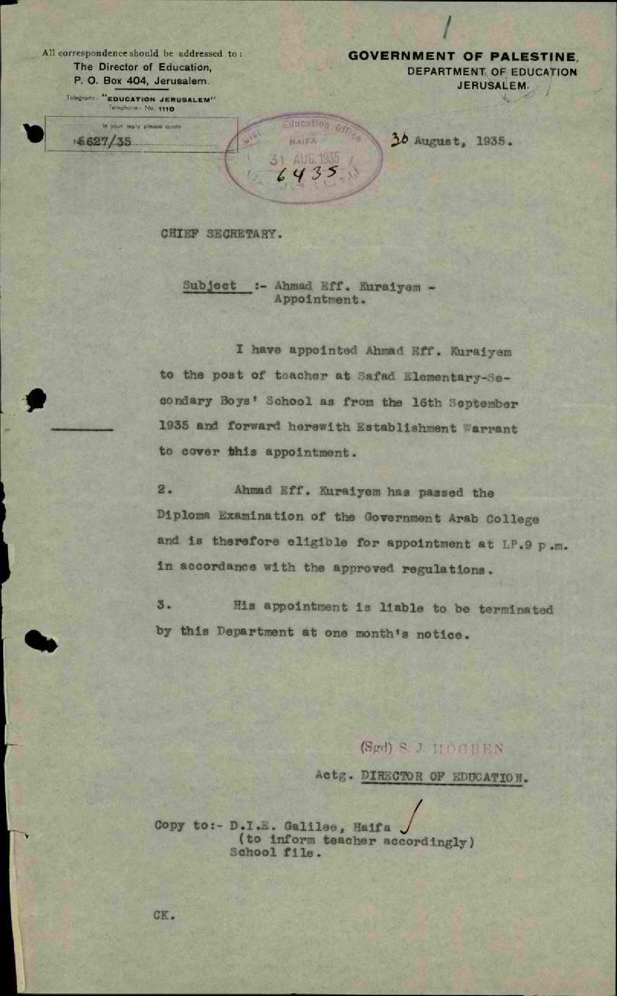 رسالة من مدير المعارف الى رئيس السكرتارية بخصوص تعيين المعلم أحمد كريّم في مدرسة صفد