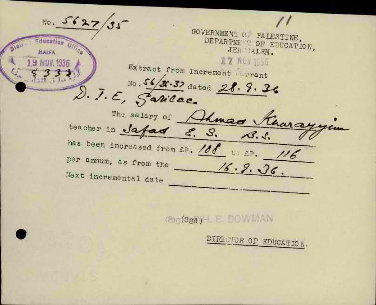 رسالة من مدير المعارف الى مفتش المعارف بخصوص زيادة راتب المعلم أحمد كريّم السنوية