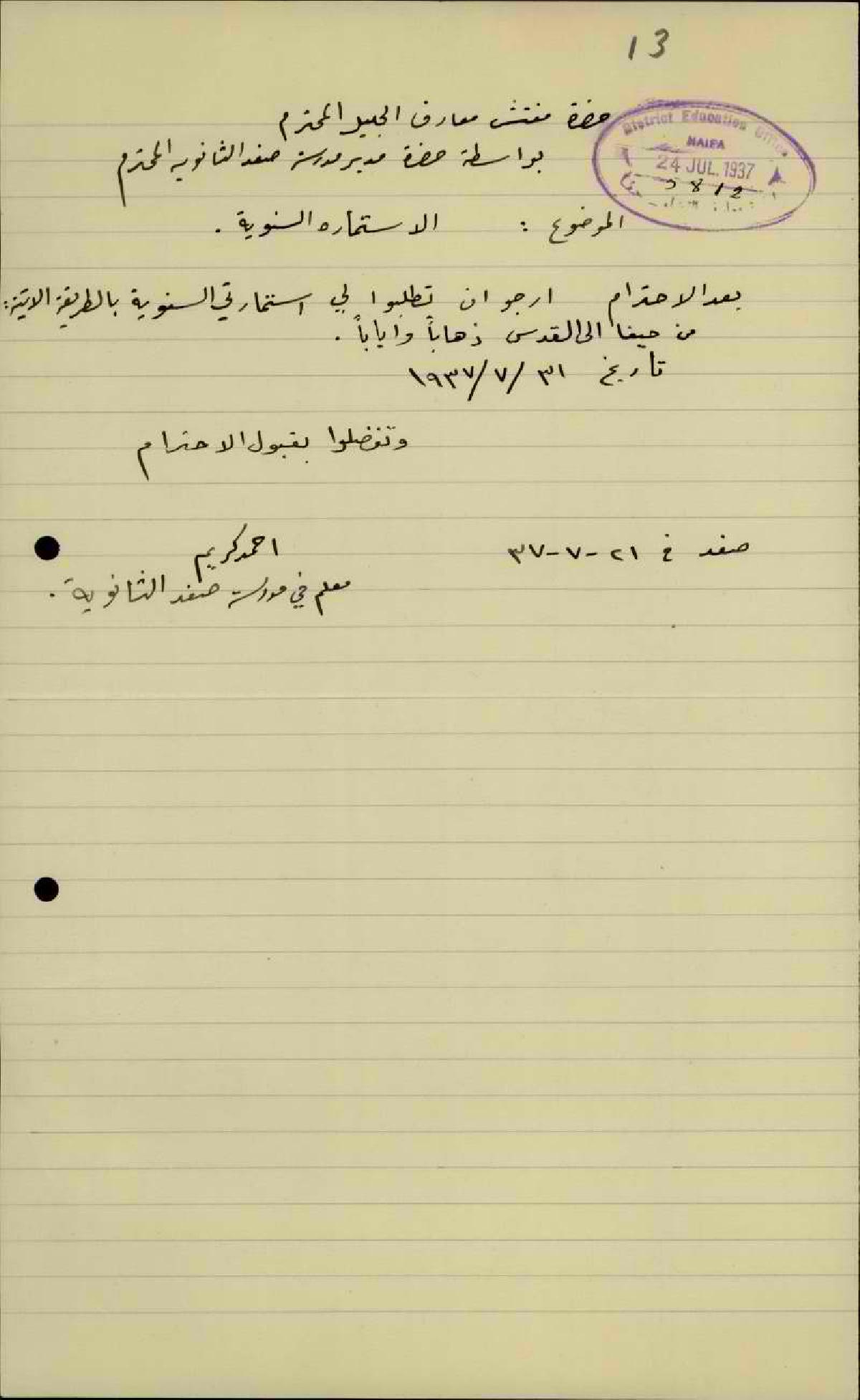 رسالة من المعلم أحمد كريّم الى مفتش المعارف بخصوص استمارة سفره السنوية