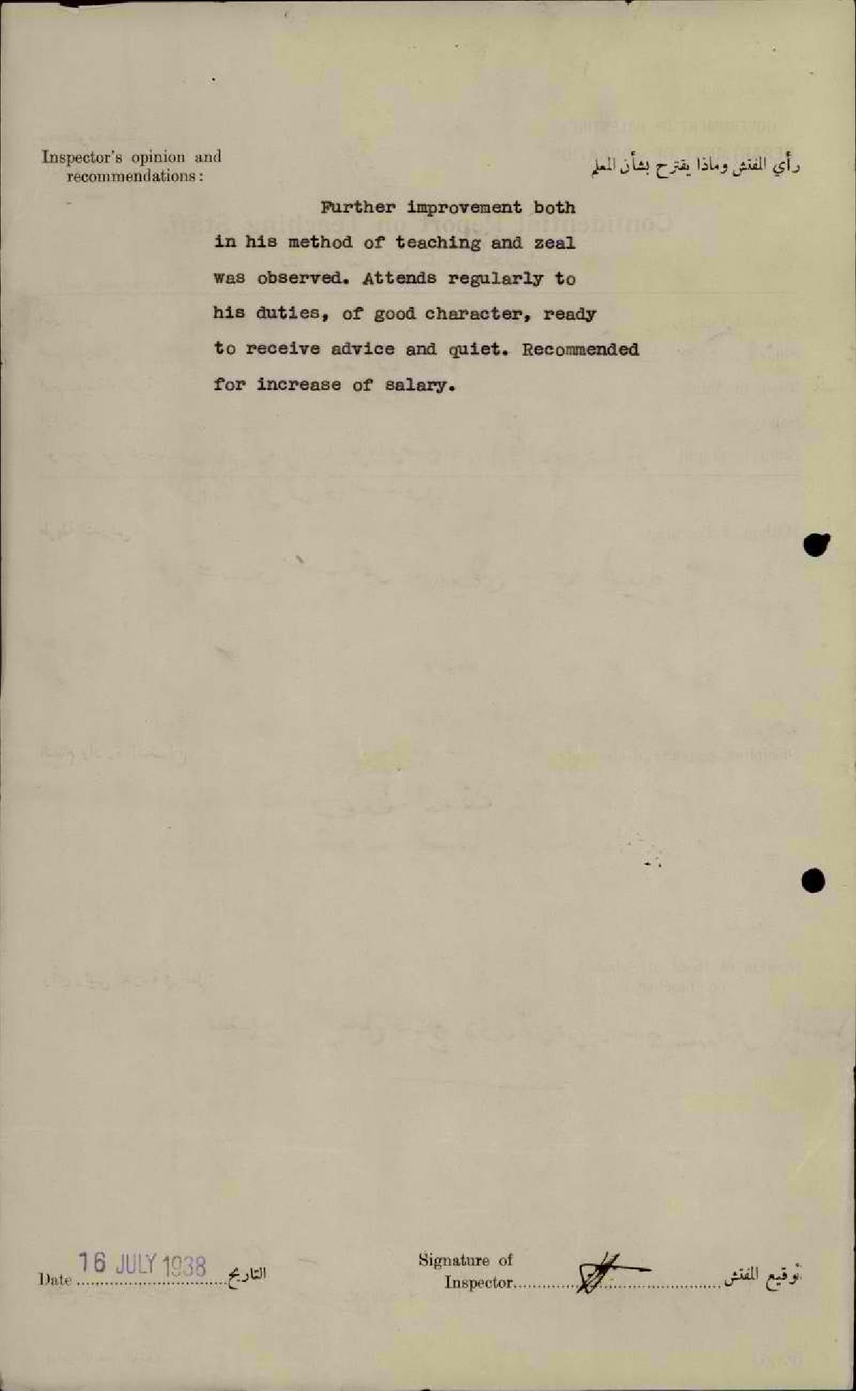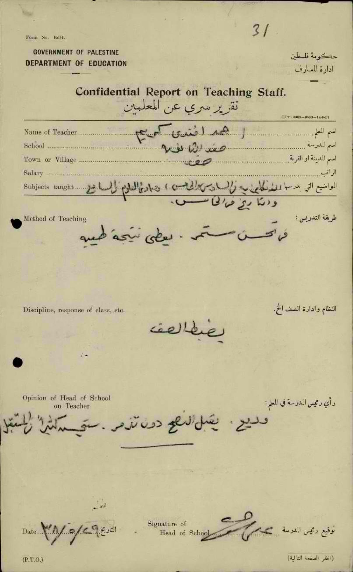 تقرير تفصيلي عن أداء المعلم أحمد كريّم في مدرسة صفد الثانوية سنة 1938