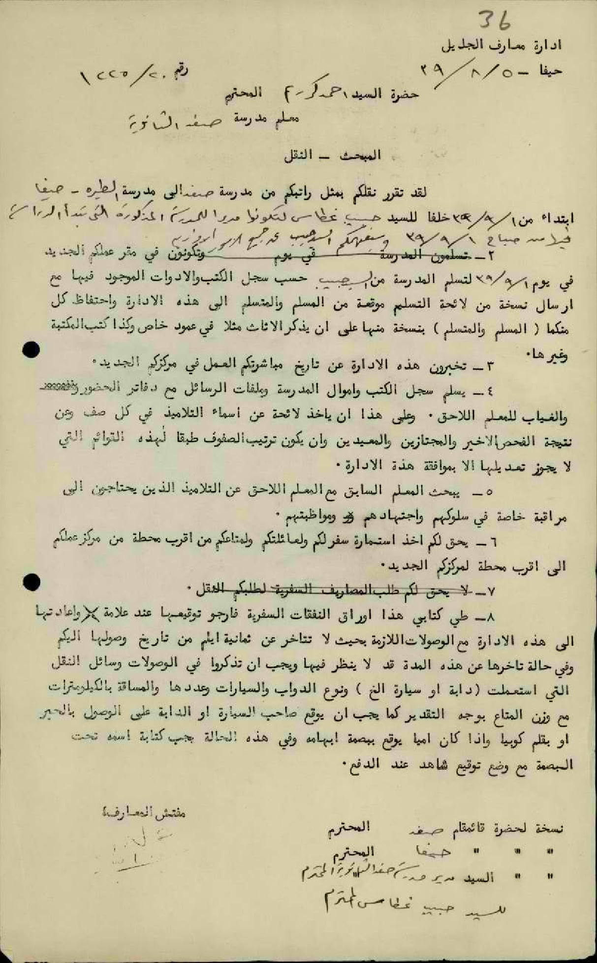 نقل المعلم أحمد كريّم من مدرسة صفد الى مدرسة طيرة حيفا