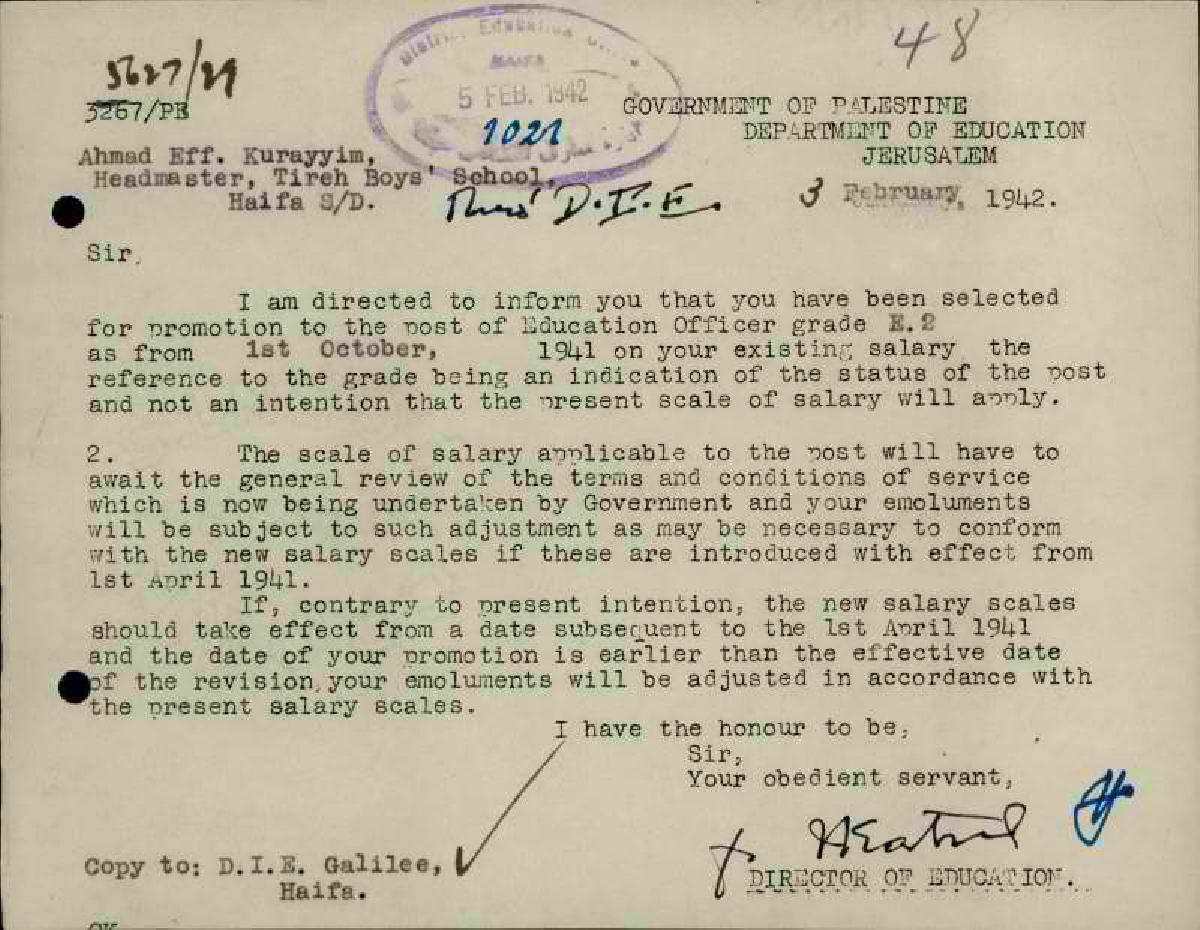 رسالة من مفتش المعارف الى المعلم أحمد كريّم بخصوص ترقيته